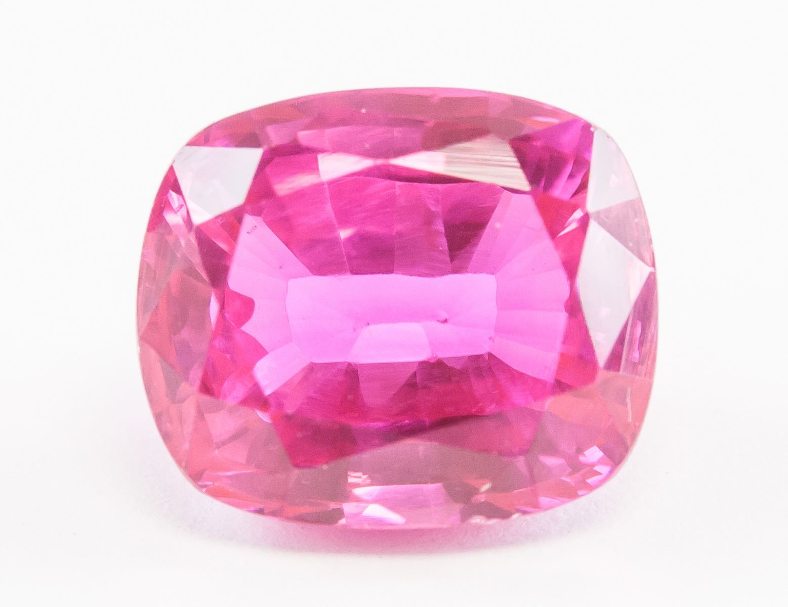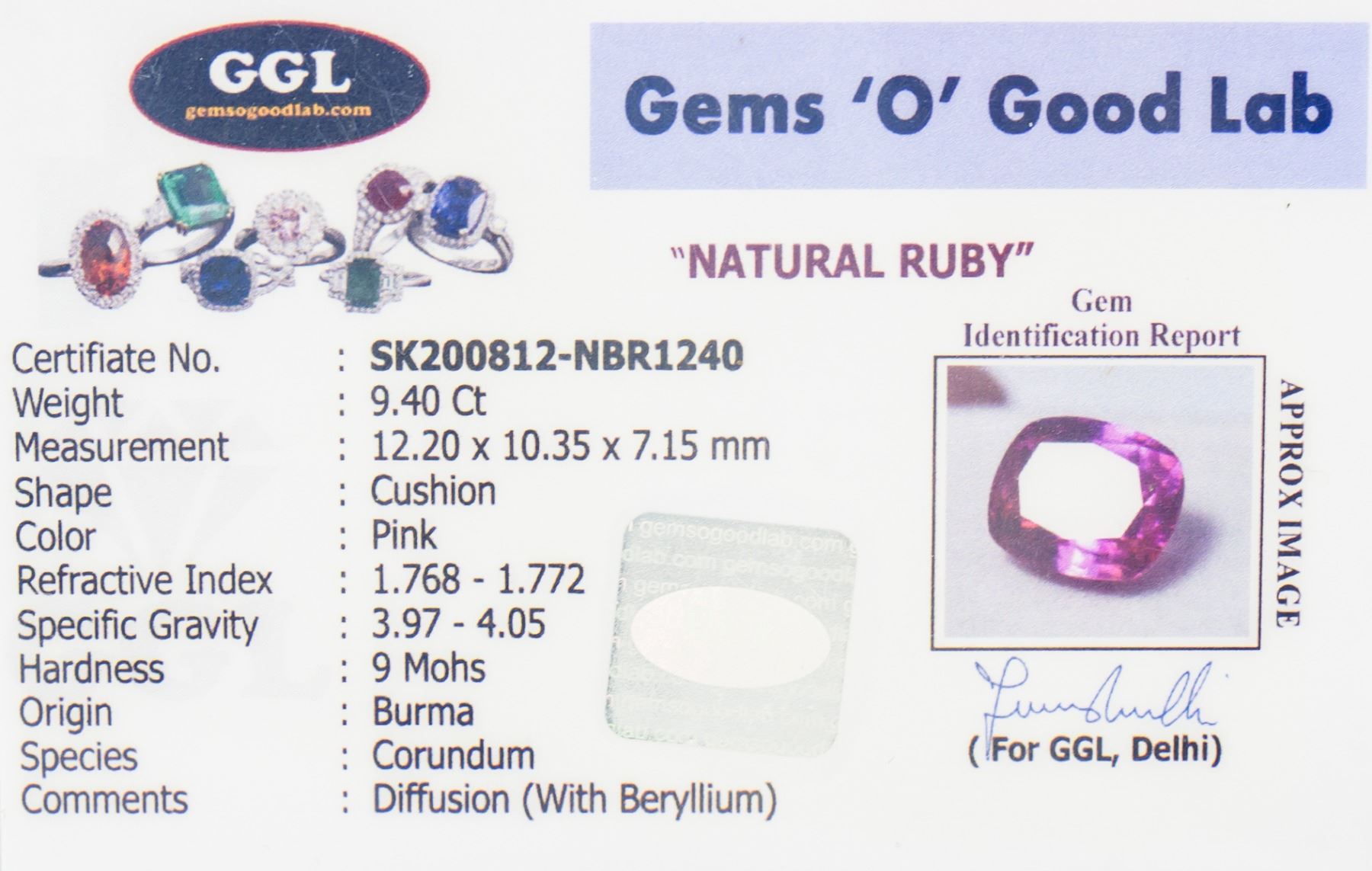 One (1) 9.40 ct cushion cut pink natural ruby. Origin: Burma. Accompanied with GGL certificate. 12.20 x 10.35 x 7.15 mm.