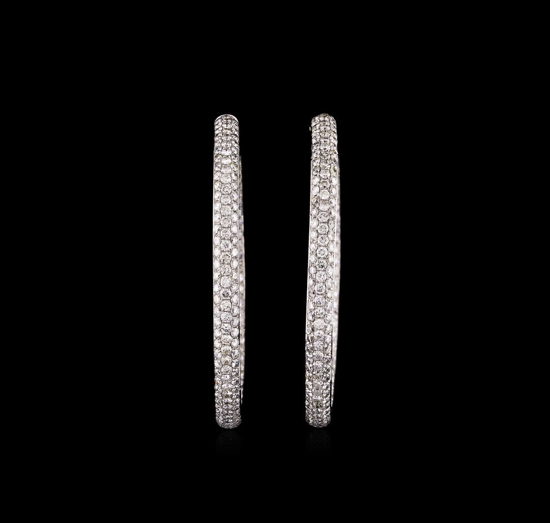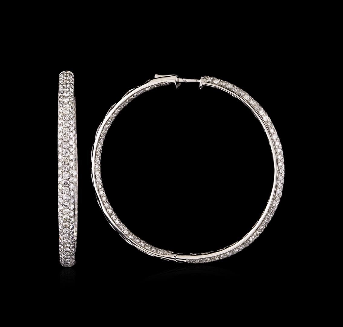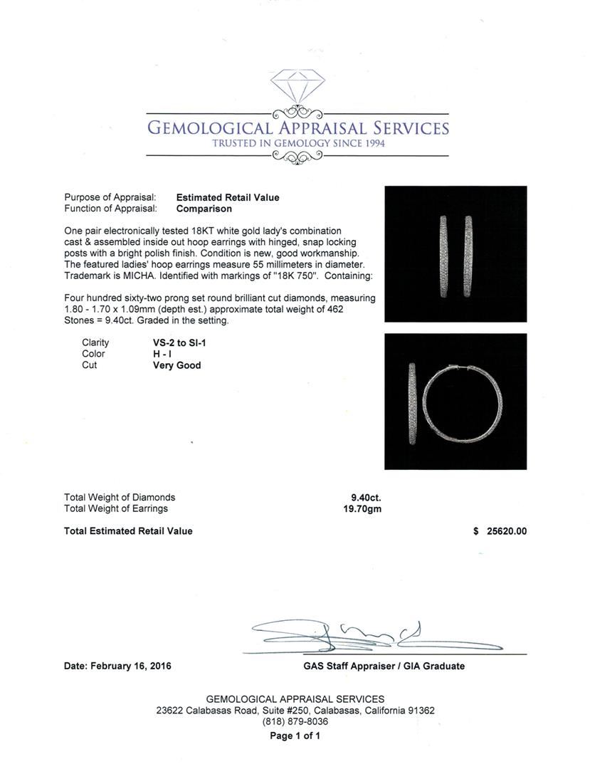 One pair electronically tested 18KT white gold lady's combination cast & assembled inside out hoop earrings with hinged, snap locking posts with a bright polish finish. The featured ladies' hoop earrings measure 55 millimeters in diameter. Trademark is MICHA. Identified with markings of "18K 750". Condition is new, good workmanship. Containing: Four Hundred Sixty-Two prong set round brilliant cut diamonds, measuring 1.80 - 1.70 x 1.09mm (depth est.) approximate total weight of 462 Stones = 9.40ct. Graded in the setting. Clarity: VS-2 to SI-1. Color: H - I. Cut Very Good. Total Weight of Diamonds 9.40ct. Total Weight of Earrings 19.70gm. GAS Appraised at $25,620.00.
