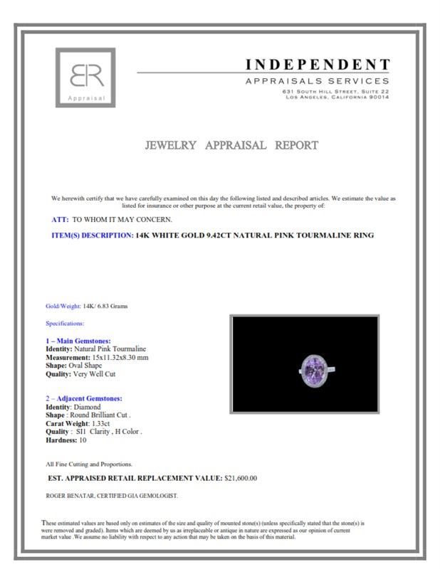 14K WHITE GOLD NATURAL COPPER BEARING PINK PARIBA TOURMLINE RING:6.83GRAM/PINK PARAIBA TOURMALINE:9.42CT/DIAMOND:1.33CT/#GVR1269