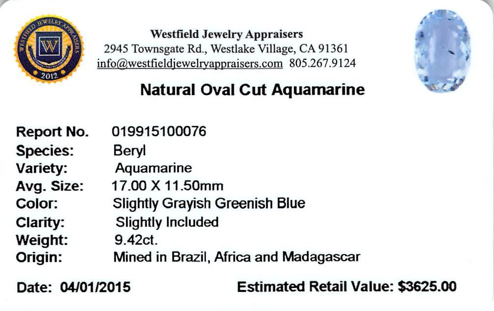 One oval cut natural aquamarine exact weight 9.42ct., clarity is slightly included, type I, medium light, very slightly grayish, very slightly greenish blue color, (GIA vslgB 4/3), cut is good. Westfield Appraised at $3,625.00.