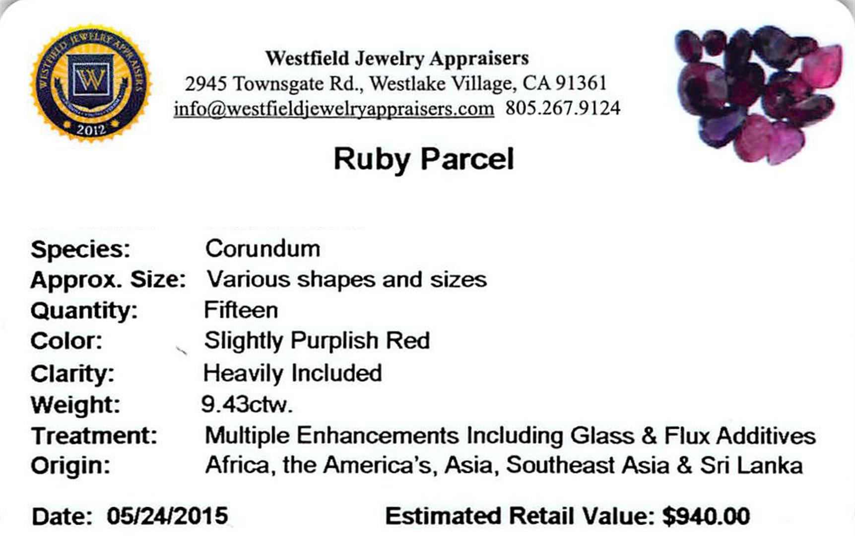 Fifteen various shapes & sizes cut natural rubies exact total weight 9.43ct., clarity is heavily included, type II, dark, very slightly brownish, slightly purplish red color, (GIA slpR 7/3), cut is good. Transmitting light somewhat diffusely, transparent to translucent. Naturally occurring internal & external characteristics are present. Indications of laboratory high temperature heat treatment, with glass & flux additives. Ruby has a low tolerance to rhodium plating, repolishing the surface, & ultrasonic cleaning. Westfield Appraised at $940.00.