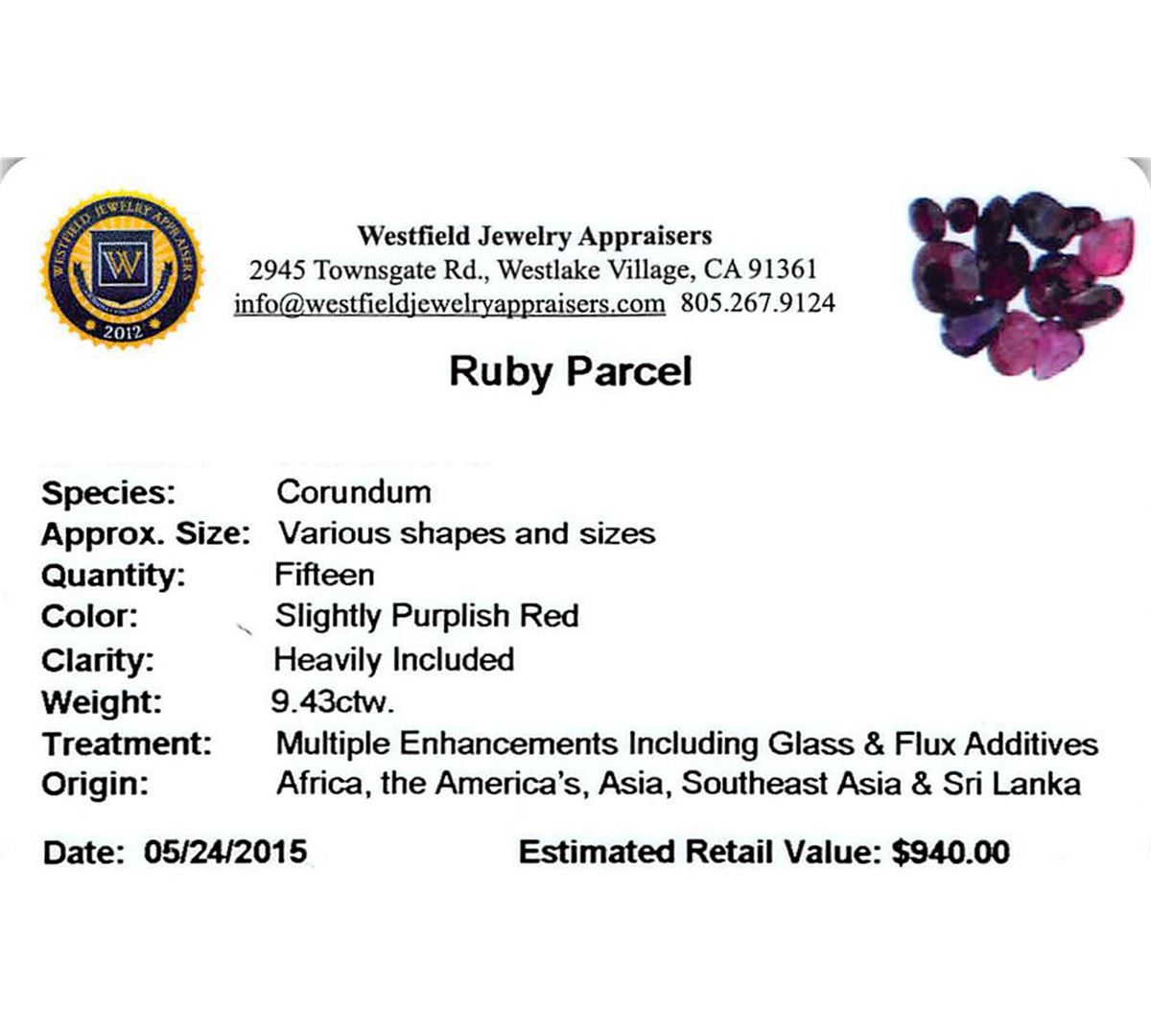 Fifteen various shapes & sizes cut natural rubies exact total weight 9.43ct., clarity is heavily included, type II, dark, very slightly brownish, slightly purplish red color, (GIA slpR 7/3), cut is good. Transmitting light somewhat diffusely, transparent to translucent. Naturally occurring internal & external characteristics are present. Indications of laboratory high temperature heat treatment, with glass & flux additives. Ruby has a low tolerance to rhodium plating, repolishing the surface, & ultrasonic cleaning. Westfield Appraised at $940.00.