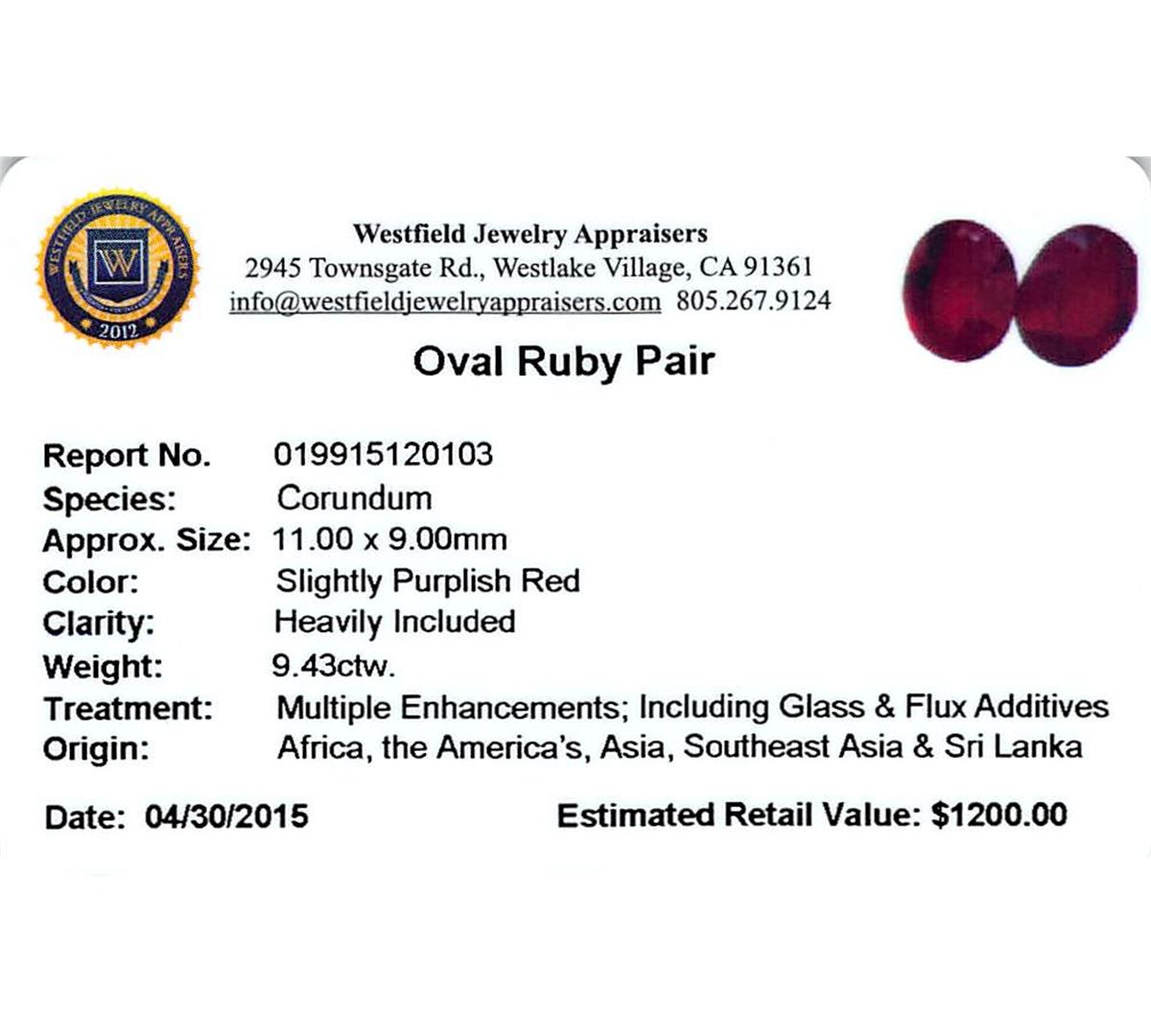 Two oval mixed cut natural rubies exact total weight 9.43ct., clarity is heavily included, type II, dark, very slightly brownish, slightly purplish red color, (GIA slpR 7/3), cut is good. Westfield Appraised at $1,200.00.