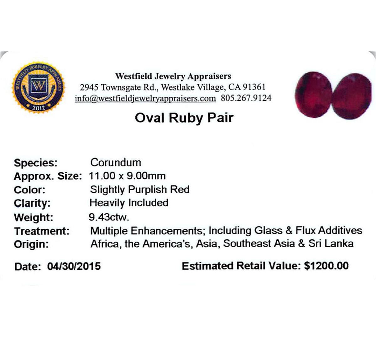 Two oval mixed cut natural rubies exact total weight 9.43ct., clarity is heavily included, type II, dark, very slightly brownish, slightly purplish red color, (GIA slpR 7/3), cut is good. Westfield Appraised at $1,200.00.