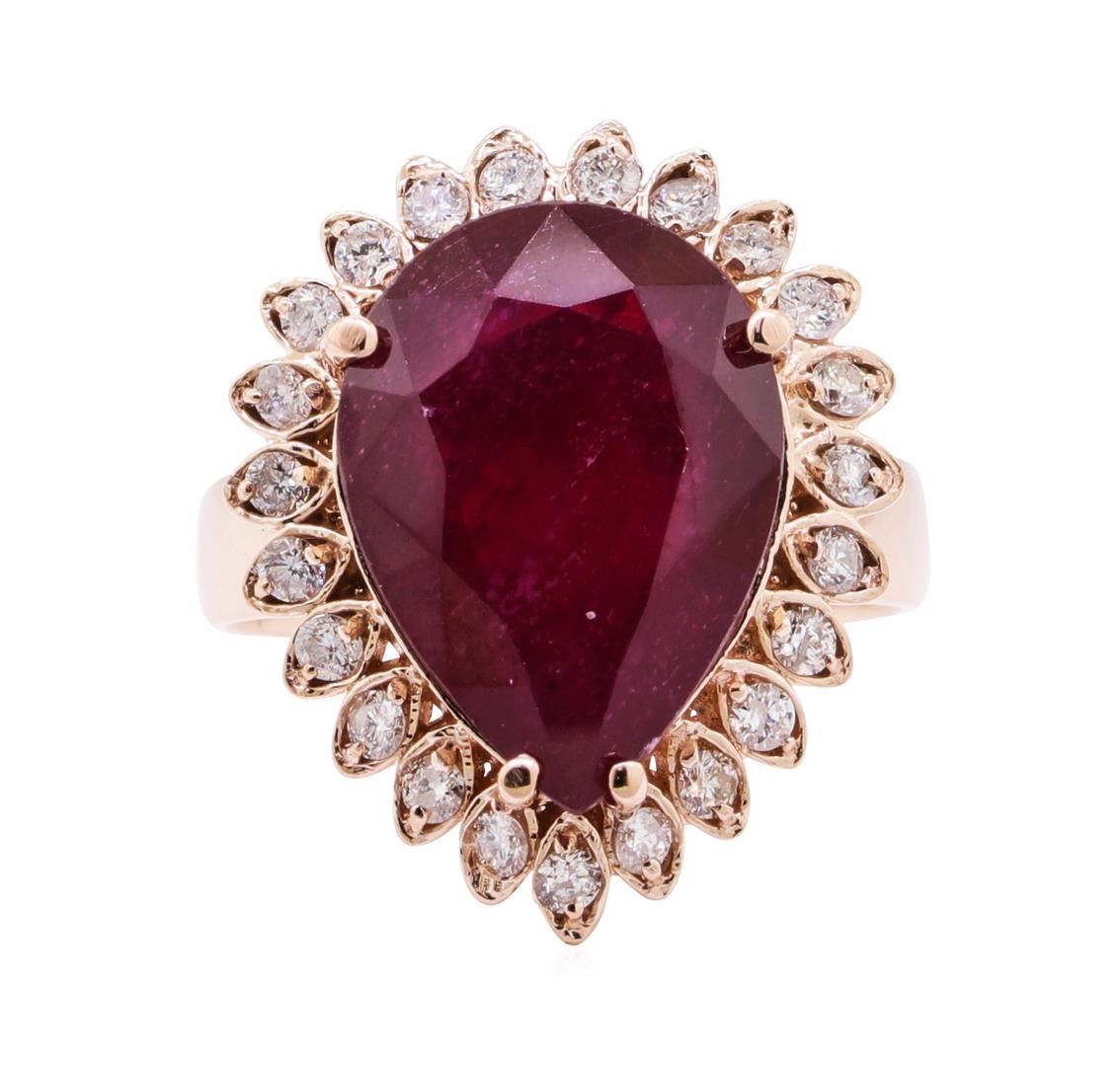 One electronically tested 14KT rose gold lady's cast fashion ring with a basket halo with a bright polish finish. The featured lady's ring has a shank measuring 2.85 millimeters wide. Identified with markings of 'K14'. Condition is new, good workmanship. Containing: One prong set pear modified mixed cut natural ruby-glass composite, measuring 15.77 x 11.38 x 5.40mm, (depth est.) 15%. bulge factor, approximate weight of 8.92ct., clarity is heavily included, medium dark, moderately strong, strongly purplish red color, (GIA stpR 6/4), cut is good. Transmitting light somewhat diffusely, semi-transparent to translucent. Naturally occurring internal & external characteristics are present. Indications of laboratory high temperature heat treatment, with glass & flux additives. Colored gemstones are presumed to have been subjected to commonly used enhancement processes. Graded in the setting. Twenty-Three prong set round brilliant cut diamonds, measuring 1.90 - 1.80 x 1.11mm (depth est.) approximate total weight of 23 Stones = 0.52ct. Graded in the setting. Color H - I Clarity SI-2 to I-1 Cut Good. Total Weight of Colored Stones 8.92ct.. Total Weight of Diamonds 0.52ct.. Total Weight of Ring 8.90gm GAS Appraised at $3595.00. GAS Appraised.