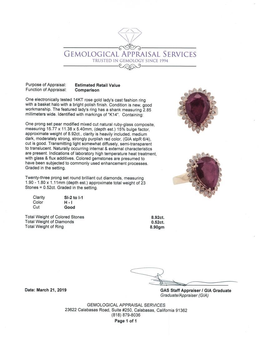 One electronically tested 14KT rose gold lady's cast fashion ring with a basket halo with a bright polish finish. The featured lady's ring has a shank measuring 2.85 millimeters wide. Identified with markings of 'K14'. Condition is new, good workmanship. Containing: One prong set pear modified mixed cut natural ruby-glass composite, measuring 15.77 x 11.38 x 5.40mm, (depth est.) 15%. bulge factor, approximate weight of 8.92ct., clarity is heavily included, medium dark, moderately strong, strongly purplish red color, (GIA stpR 6/4), cut is good. Transmitting light somewhat diffusely, semi-transparent to translucent. Naturally occurring internal & external characteristics are present. Indications of laboratory high temperature heat treatment, with glass & flux additives. Colored gemstones are presumed to have been subjected to commonly used enhancement processes. Graded in the setting. Twenty-Three prong set round brilliant cut diamonds, measuring 1.90 - 1.80 x 1.11mm (depth est.) approximate total weight of 23 Stones = 0.52ct. Graded in the setting. Color H - I Clarity SI-2 to I-1 Cut Good. Total Weight of Colored Stones 8.92ct.. Total Weight of Diamonds 0.52ct.. Total Weight of Ring 8.90gm GAS Appraised at $3595.00. GAS Appraised.