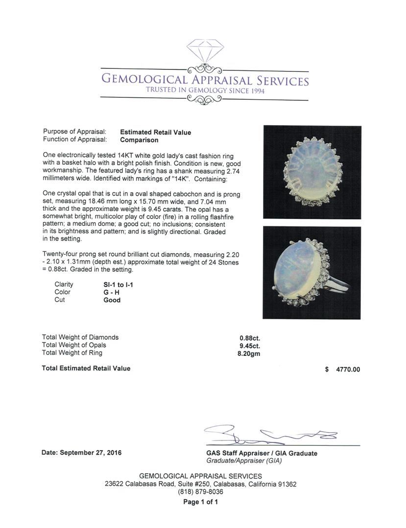 One electronically tested 14KT white gold lady's cast fashion ring with a basket halo with a bright polish finish. The featured lady's ring has a shank measuring 2.74 millimeters wide. Identified with markings of '14K'. Condition is new, good workmanship. Containing: One crystal opal that is cut in a oval shaped cabochon and is prong set, measuring 18.46 mm long x 15.70 mm wide, and 7.04 mm thick and the approximate weight is 9.45 carats. The opal has a somewhat bright, multicolor play of color (fire) in a rolling flashfire pattern; a medium dome; a good cut; no inclusions; consistent in its brightness and pattern; and is slightly directional. Graded in the setting. Twenty-Four prong set round brilliant cut diamonds, measuring 2.20 - 2.10 x 1.31mm (depth est.) approximate total weight of 24 Stones = 0.88ct. Graded in the setting. Clarity SI-1 to I-1. Color: G - H Cut Good. Total Weight of Diamonds 0.88ct.. Total Weight of Opals 9.45ct.. Total Weight of Ring 8.20gm. GAS Appraised at $4,770.00.