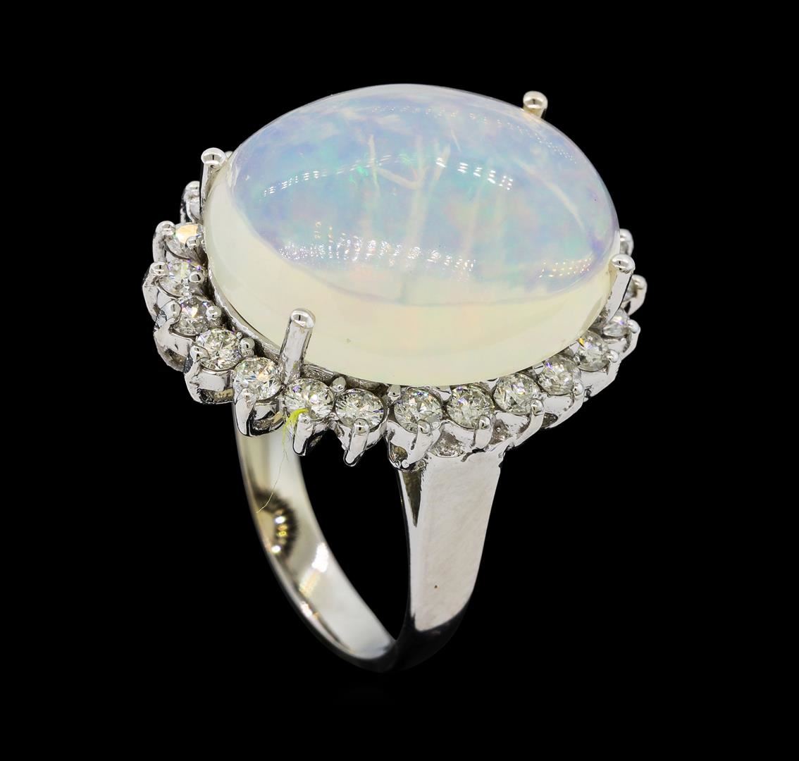 One electronically tested 14KT white gold lady's cast fashion ring with a basket halo with a bright polish finish. The featured lady's ring has a shank measuring 2.74 millimeters wide. Identified with markings of '14K'. Condition is new, good workmanship. Containing: One crystal opal that is cut in a oval shaped cabochon and is prong set, measuring 18.46 mm long x 15.70 mm wide, and 7.04 mm thick and the approximate weight is 9.45 carats. The opal has a somewhat bright, multicolor play of color (fire) in a rolling flashfire pattern; a medium dome; a good cut; no inclusions; consistent in its brightness and pattern; and is slightly directional. Graded in the setting. Twenty-Four prong set round brilliant cut diamonds, measuring 2.20 - 2.10 x 1.31mm (depth est.) approximate total weight of 24 Stones = 0.88ct. Graded in the setting. Clarity SI-1 to I-1. Color: G - H Cut Good. Total Weight of Diamonds 0.88ct.. Total Weight of Opals 9.45ct.. Total Weight of Ring 8.20gm. GAS Appraised at $4,770.00.