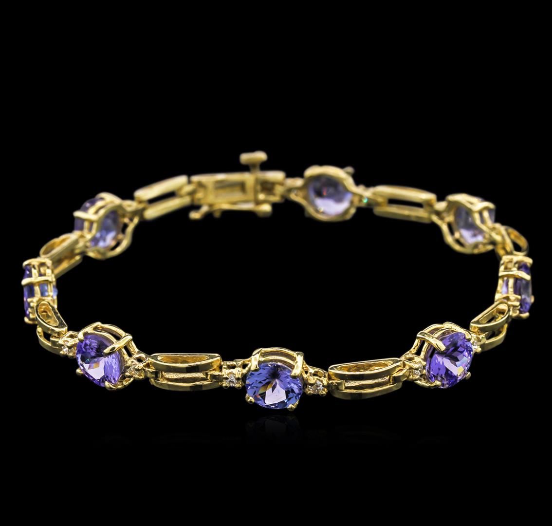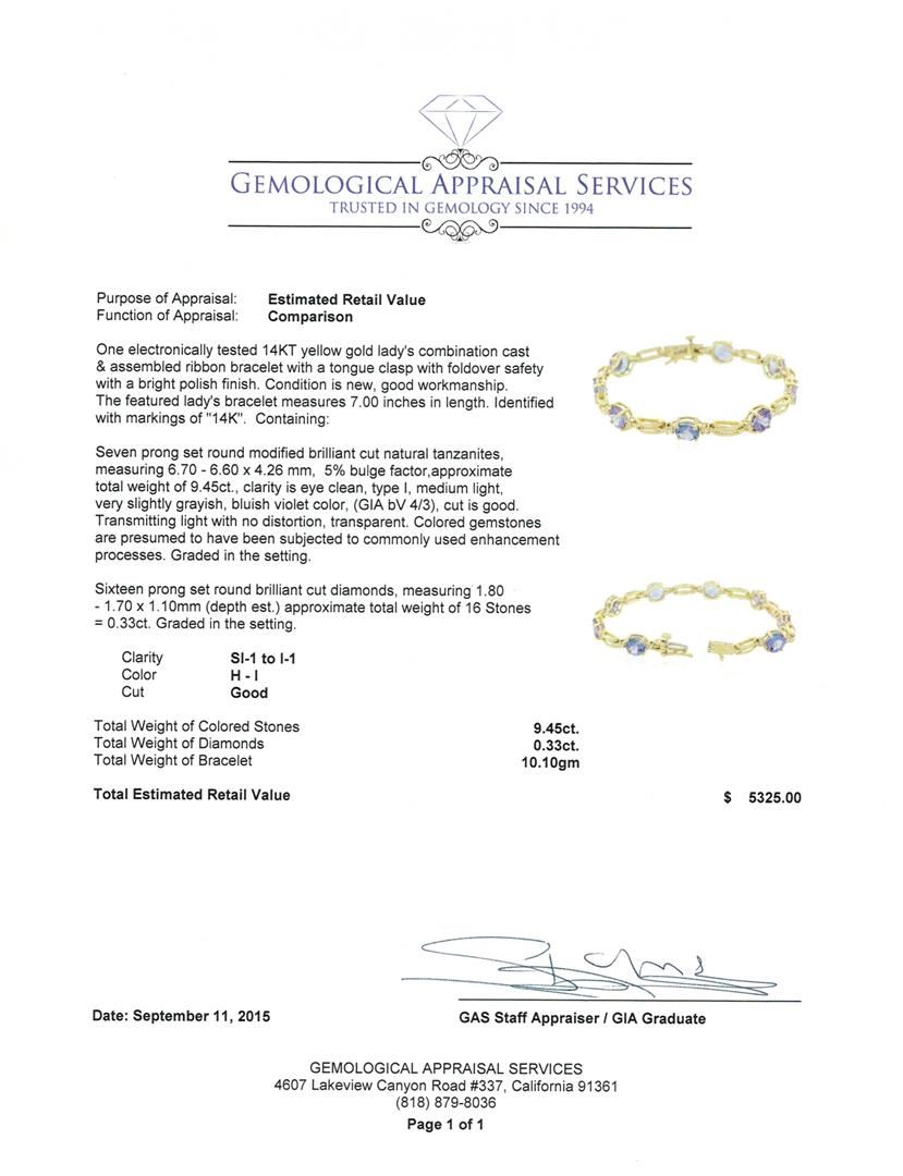One electronically tested 14KT yellow gold lady's combination cast & assembled ribbon bracelet with a tongue clasp with foldover safety with a bright polish finish. The featured lady's bracelet has a length measuring 7.00 inches. Identified with markings of "14K". Condition is new, good workmanship. Containing: Seven prong set round modified brilliant cut natural tanzanites, measuring 6.70 - 6.60 x 4.26 mm, 5% bulge factor, approximate total weight of 9.45ct., clarity is eye clean, type I, medium light, very slightly grayish, bluish violet color, (GIA bV 4/3), cut is good. Transmitting light with no distortion, transparent. Colored gemstones are presumed to have been subjected to commonly used enhancement processes. Graded in the setting. Sixteen prong set round brilliant cut diamonds, measuring 1.80 - 1.70 x 1.10mm (depth est.) approximate total weight of 16 Stones = 0.33ct. Graded in the setting. Clarity: SI-1 to I-1. Color: H - I. Cut Good. Total Weight of Colored Stones 9.45ct. Total Weight of Diamonds 0.33ct. Total Weight of Bracelet 10.10gm. GAS Appraised at $5,325.00.