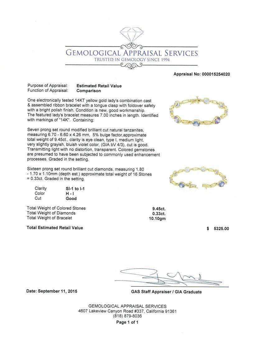 One electronically tested 14KT yellow gold lady's combination cast & assembled ribbon bracelet with a tongue clasp with foldover safety with a bright polish finish. The featured lady's bracelet has a length measuring 7.00 inches. Identified with markings of "14K". Condition is new, good workmanship. Containing: Seven prong set round modified brilliant cut natural tanzanites, measuring 6.70 - 6.60 x 4.26 mm, 5% bulge factor, approximate total weight of 9.45ct., clarity is eye clean, type I, medium light, very slightly grayish, bluish violet color, (GIA bV 4/3), cut is good. Transmitting light with no distortion, transparent. Colored gemstones are presumed to have been subjected to commonly used enhancement processes. Graded in the setting. Sixteen prong set round brilliant cut diamonds, measuring 1.80 - 1.70 x 1.10mm (depth est.) approximate total weight of 16 Stones = 0.33ct. Graded in the setting. Clarity: SI-1 to I-1. Color: H - I. Cut Good. Total Weight of Colored Stones 9.45ct. Total Weight of Diamonds 0.33ct. Total Weight of Bracelet 10.10gm. GAS Appraised at $5,325.00.