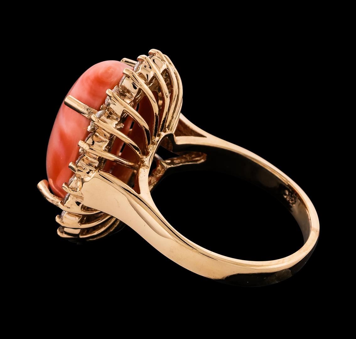 One electronically tested 14KT rose gold lady's cast fashion ring with a basket halo with a bright polish finish. The featured lady's ring has a shank measuring 2.57 millimeters wide. Identified with markings of '14K'. Condition is new, good workmanship. Containing: One prong set oval cabochon standard cut natural pink coral, measuring 16.03 x 12.04 x 5.12mm, (depth est.) 20%. bulge factor, approximate weight of 9.47ct., medium light, very slightly brownish, reddish orange color, (GIA rO 4/3), cut is very good. The featured coral has marbled white striations evenly textured throughout the stone. Colored gemstones are presumed to have been subjected to commonly used enhancement processes. Graded in the setting. Twenty-Two prong set round brilliant cut diamonds, measuring 2.20 - 2.10 x 1.33mm (depth est.) approximate total weight of 22 Stones = 0.83ct. Graded in the setting. Clarity SI-1 to SI-2. Color: H - I Cut Good. Total Weight of Colored Stones 9.47ct.. Total Weight of Diamonds 0.83ct.. Total Weight of Ring 7.40gm. GAS Appraised at $4,810.00.