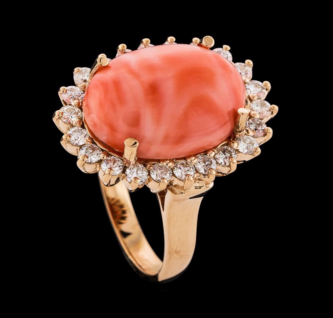 One electronically tested 14KT rose gold lady's cast fashion ring with a basket halo with a bright polish finish. The featured lady's ring has a shank measuring 2.57 millimeters wide. Identified with markings of '14K'. Condition is new, good workmanship. Containing: One prong set oval cabochon standard cut natural pink coral, measuring 16.03 x 12.04 x 5.12mm, (depth est.) 20%. bulge factor, approximate weight of 9.47ct., medium light, very slightly brownish, reddish orange color, (GIA rO 4/3), cut is very good. The featured coral has marbled white striations evenly textured throughout the stone. Colored gemstones are presumed to have been subjected to commonly used enhancement processes. Graded in the setting. Twenty-Two prong set round brilliant cut diamonds, measuring 2.20 - 2.10 x 1.33mm (depth est.) approximate total weight of 22 Stones = 0.83ct. Graded in the setting. Clarity SI-1 to SI-2. Color: H - I Cut Good. Total Weight of Colored Stones 9.47ct.. Total Weight of Diamonds 0.83ct.. Total Weight of Ring 7.40gm. GAS Appraised at $4,810.00.
