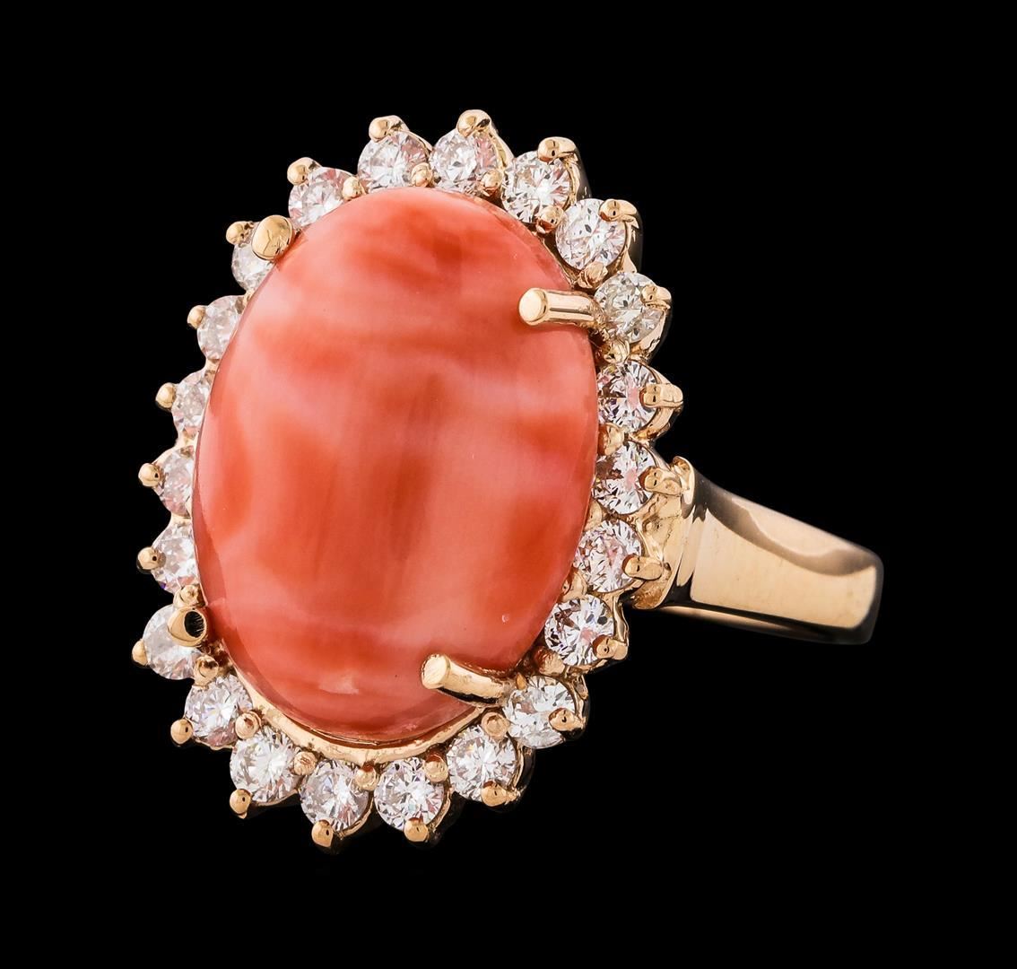 One electronically tested 14KT rose gold lady's cast fashion ring with a basket halo with a bright polish finish. The featured lady's ring has a shank measuring 2.57 millimeters wide. Identified with markings of '14K'. Condition is new, good workmanship. Containing: One prong set oval cabochon standard cut natural pink coral, measuring 16.03 x 12.04 x 5.12mm, (depth est.) 20%. bulge factor, approximate weight of 9.47ct., medium light, very slightly brownish, reddish orange color, (GIA rO 4/3), cut is very good. The featured coral has marbled white striations evenly textured throughout the stone. Colored gemstones are presumed to have been subjected to commonly used enhancement processes. Graded in the setting. Twenty-Two prong set round brilliant cut diamonds, measuring 2.20 - 2.10 x 1.33mm (depth est.) approximate total weight of 22 Stones = 0.83ct. Graded in the setting. Clarity SI-1 to SI-2. Color: H - I Cut Good. Total Weight of Colored Stones 9.47ct.. Total Weight of Diamonds 0.83ct.. Total Weight of Ring 7.40gm. GAS Appraised.