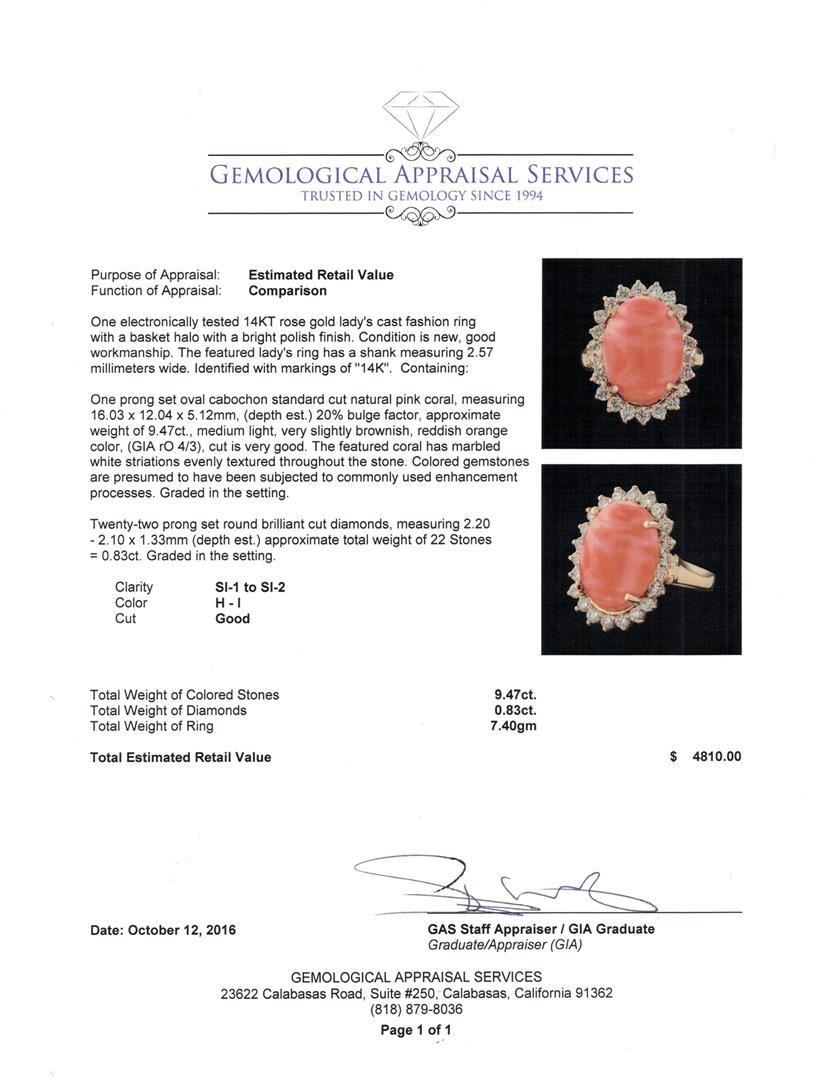 One electronically tested 14KT rose gold lady's cast fashion ring with a basket halo with a bright polish finish. The featured lady's ring has a shank measuring 2.57 millimeters wide. Identified with markings of '14K'. Condition is new, good workmanship. Containing: One prong set oval cabochon standard cut natural pink coral, measuring 16.03 x 12.04 x 5.12mm, (depth est.) 20%. bulge factor, approximate weight of 9.47ct., medium light, very slightly brownish, reddish orange color, (GIA rO 4/3), cut is very good. The featured coral has marbled white striations evenly textured throughout the stone. Colored gemstones are presumed to have been subjected to commonly used enhancement processes. Graded in the setting. Twenty-Two prong set round brilliant cut diamonds, measuring 2.20 - 2.10 x 1.33mm (depth est.) approximate total weight of 22 Stones = 0.83ct. Graded in the setting. Clarity SI-1 to SI-2. Color: H - I Cut Good. Total Weight of Colored Stones 9.47ct.. Total Weight of Diamonds 0.83ct.. Total Weight of Ring 7.40gm. GAS Appraised.