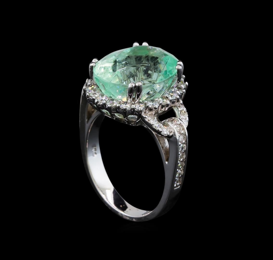 One electronically tested 14KT white gold lady's cast fashion ring with a basket halo with a bright polish finish. The featured lady's ring has a shank measuring 3.11 millimeters wide. Identified with markings of 'K14'. Condition is new, good workmanship. Containing: One prong set oval modified brilliant cut natural emerald, measuring 14.48 x 11.75 x 10.24mm, (depth est.) approximate weight of 9.47ct., clarity is moderately included, light, moderately strong, green color, (GIA G 3/4), cut is very good. Transmitting light somewhat diffusely, transparent to translucent. Naturally occurring internal & external characteristics are present. Indications of oil residue. Colored gemstones are presumed to have been subjected to commonly used enhancement processes. Graded in the setting. Twenty prong set round brilliant cut diamonds, measuring 2.10 - 2.00 x 1.28mm (depth est.) approximate total weight of 20 Stones = 0.65ct. Graded in the setting. Clarity SI-1 to SI-2. Color: H - I Cut Good Twenty-Eight prong set round brilliant cut diamonds, measuring 1.50 - 1.40 x 0.90mm (depth est.) approximate total weight of 28 Stones = 0.33ct. Graded in the setting. Clarity SI-1 to I-1. Color: H - I Cut Good. Total Weight of Colored Stones 9.47ct.. Total Weight of Diamonds 0.98ct.. Total Weight of Ring 7.60gm. GAS Appraised at $12,205.00.