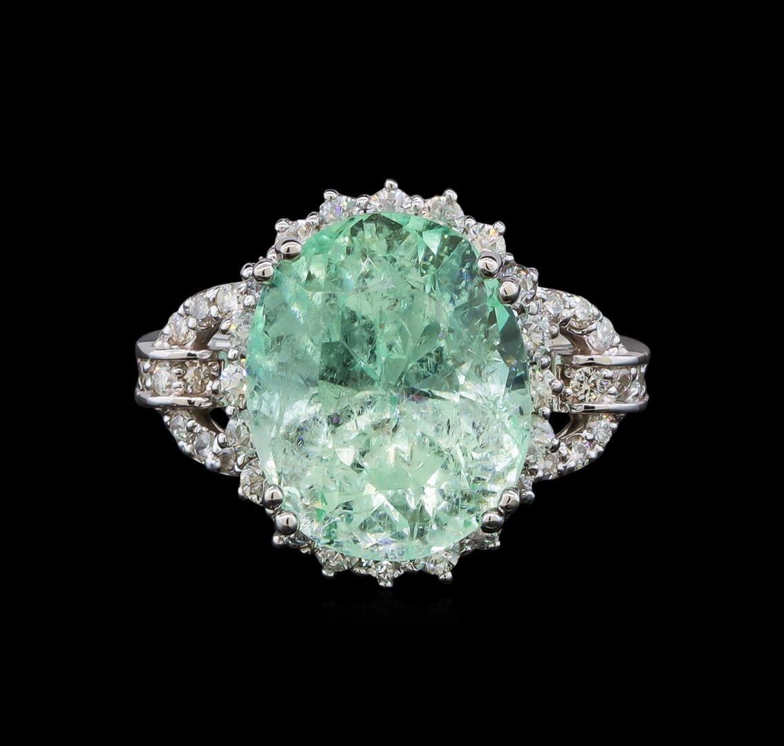 One electronically tested 14KT white gold lady's cast fashion ring with a basket halo with a bright polish finish. The featured lady's ring has a shank measuring 3.11 millimeters wide. Identified with markings of 'K14'. Condition is new, good workmanship. Containing: One prong set oval modified brilliant cut natural emerald, measuring 14.48 x 11.75 x 10.24mm, (depth est.) approximate weight of 9.47ct., clarity is moderately included, light, moderately strong, green color, (GIA G 3/4), cut is very good. Transmitting light somewhat diffusely, transparent to translucent. Naturally occurring internal & external characteristics are present. Indications of oil residue. Colored gemstones are presumed to have been subjected to commonly used enhancement processes. Graded in the setting. Twenty prong set round brilliant cut diamonds, measuring 2.10 - 2.00 x 1.28mm (depth est.) approximate total weight of 20 Stones = 0.65ct. Graded in the setting. Clarity SI-1 to SI-2. Color: H - I Cut Good Twenty-Eight prong set round brilliant cut diamonds, measuring 1.50 - 1.40 x 0.90mm (depth est.) approximate total weight of 28 Stones = 0.33ct. Graded in the setting. Clarity SI-1 to I-1. Color: H - I Cut Good. Total Weight of Colored Stones 9.47ct.. Total Weight of Diamonds 0.98ct.. Total Weight of Ring 7.60gm. GAS Appraised at $12,205.00.