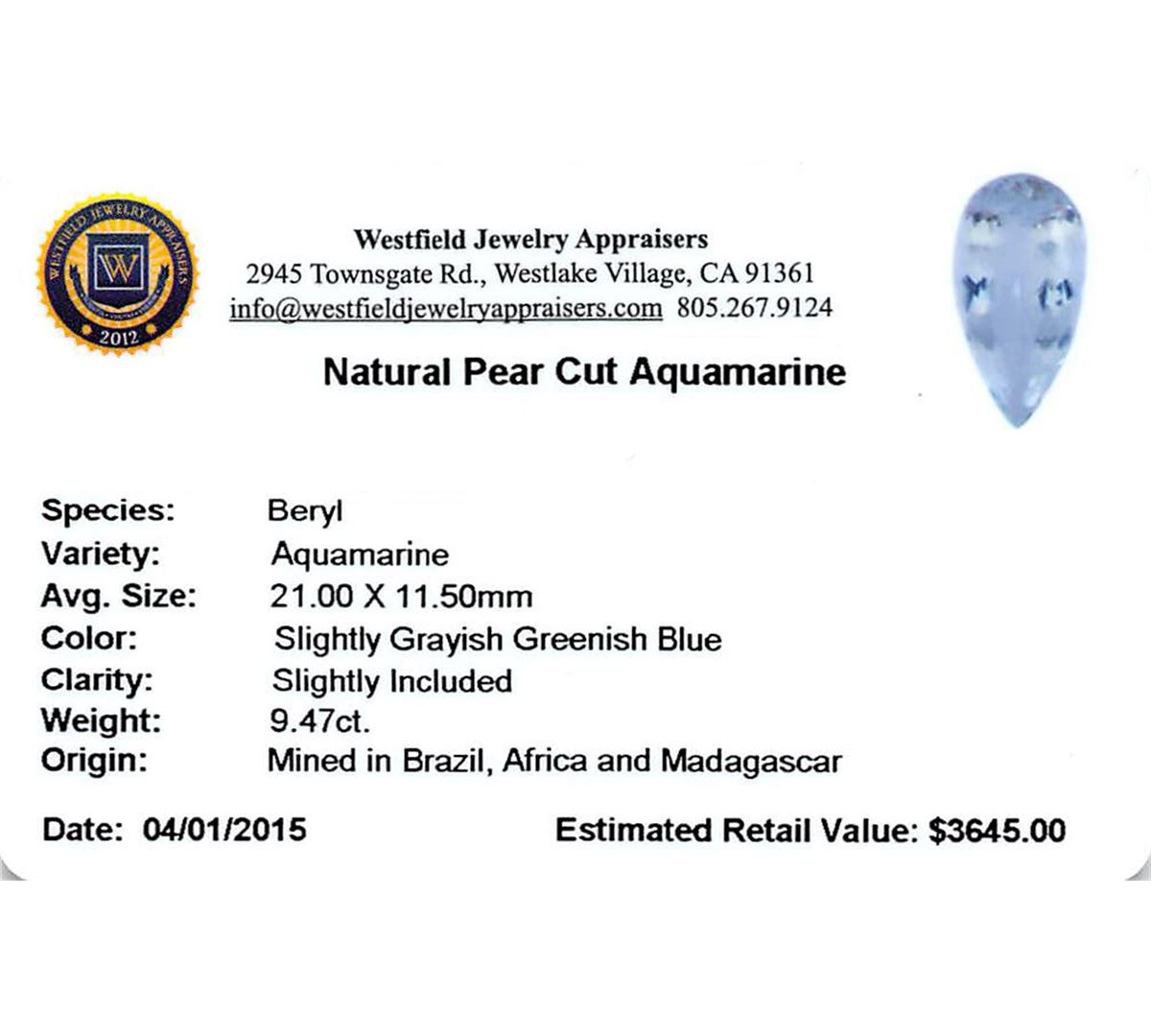 One pear cut natural aquamarine exact weight 9.47ct., clarity is slightly included, type I, medium, very slightly grayish, very slightly greenish blue color, (GIA vslgB 5/3), cut is good. Westfield Appraised at $3,645.00.
