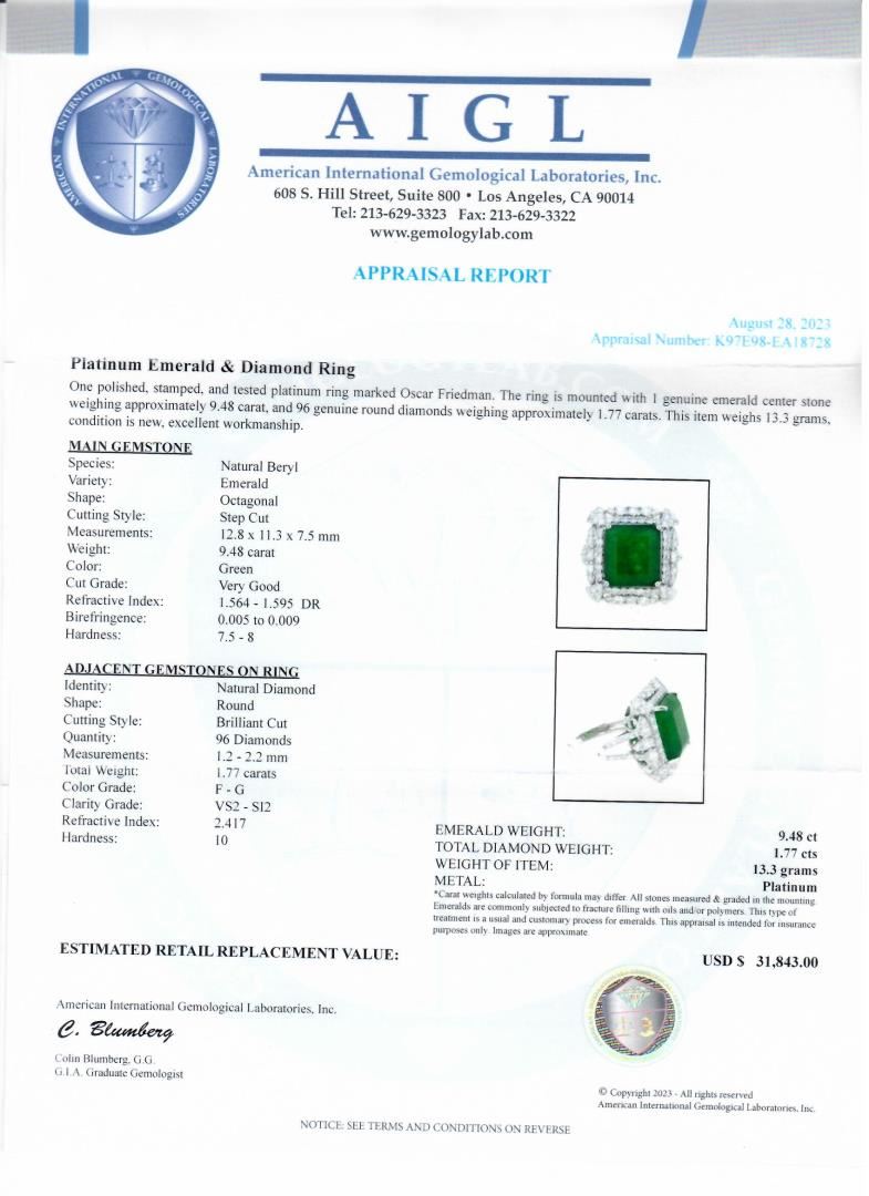 One polished, stamped, and tested platinum ring marked Oscar Friedman. The ring is mounted with 1 genuine emerald center stone weighing approximately 9.48 carat, and 96 genuine round diamonds weighing approximately 1.77 carats. This item weighs 13.3 grams, condition is new, excellent workmanship. #MAIN GEMSTONE# Species: Natural Beryl; Variety: Emerald; Shape: Octagonal; Cutting Style: Step Cut; Measurements: 12.8 x 11.3 x 7.5mm; Weight: 9.48 carat; Color: Green; Cut Grade: Very Good; Refractive Index: 1.564 - 1.595 DR; Birefringence: 0.005 to 0.009; Hardness: 7.5 - 8 #ADJACENT GEMSTONES ON RING# Identity: Natural Diamond; Shape: Round; Cutting Style: Brilliant Cut; Quantity: 96 Diamonds; Measurements: 1.2 - 2.2mm; Total Weight: 1.77 carats; Color Grade: F-G; Clarity Grade: VS2-SI2; Refractive Index: 2.417; Hardness: 10 #EMERALD WEIGHT: 9.48 ct; TOTAL DIAMOND WEIGHT: 1.77 cts; WEIGHT OF ITEM: 13.3 grams; METAL: Platinum #Size: 7