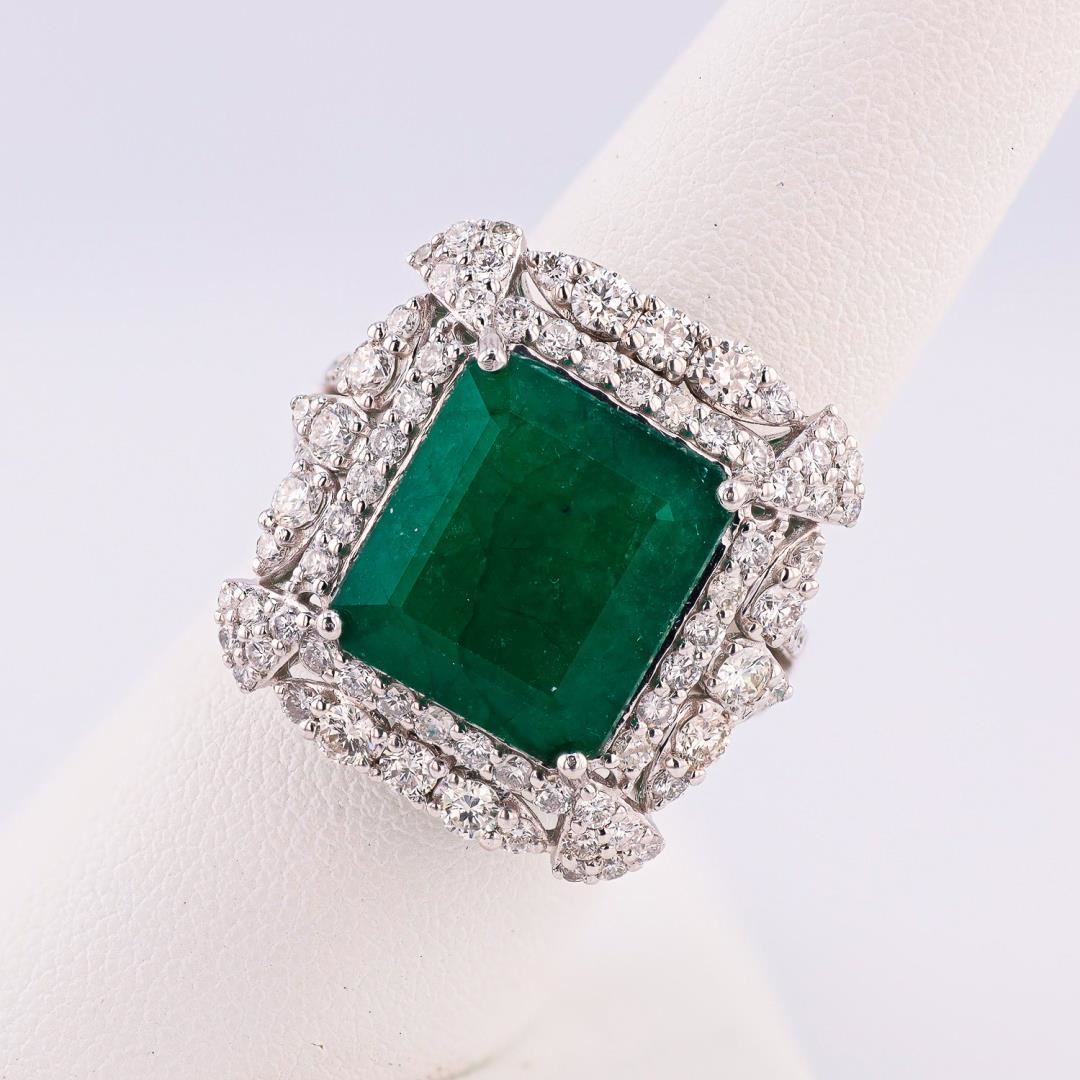 One polished, stamped, and tested platinum ring marked Oscar Friedman. The ring is mounted with 1 genuine emerald center stone weighing approximately 9.48 carat, and 96 genuine round diamonds weighing approximately 1.77 carats. This item weighs 13.3 grams, condition is new, excellent workmanship. #MAIN GEMSTONE# Species: Natural Beryl; Variety: Emerald; Shape: Octagonal; Cutting Style: Step Cut; Measurements: 12.8 x 11.3 x 7.5mm; Weight: 9.48 carat; Color: Green; Cut Grade: Very Good; Refractive Index: 1.564 - 1.595 DR; Birefringence: 0.005 to 0.009; Hardness: 7.5 - 8 #ADJACENT GEMSTONES ON RING# Identity: Natural Diamond; Shape: Round; Cutting Style: Brilliant Cut; Quantity: 96 Diamonds; Measurements: 1.2 - 2.2mm; Total Weight: 1.77 carats; Color Grade: F-G; Clarity Grade: VS2-SI2; Refractive Index: 2.417; Hardness: 10 #EMERALD WEIGHT: 9.48 ct; TOTAL DIAMOND WEIGHT: 1.77 cts; WEIGHT OF ITEM: 13.3 grams; METAL: Platinum #Size: 7