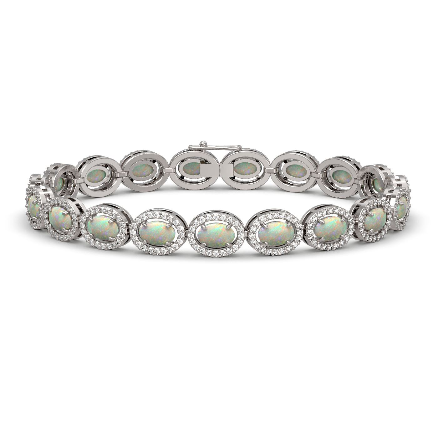 REF-251W8F -40466 ---- 9.5 CTW Opal & Diamond Halo Bracelet 10K White Gold ---- Luxury Designer Brand Bracelet Appraised at $13,850 Certificate Number US40466 10k White gold, Bracelet Size is 7 Inches, Bracelet measuring approx. 8 mm x 7 Inches, weighing in total approx. 13 grams. Made in the USA and is stamped 10k, Main stone 6.65 carat total weight containing 19 pieces of White with Fire color with AAA quality Oval shape cut Opal , Stone #2 2.85 carat total weight containing 380 pieces of G-H color with VS/SI quality Round shape cut Diamond