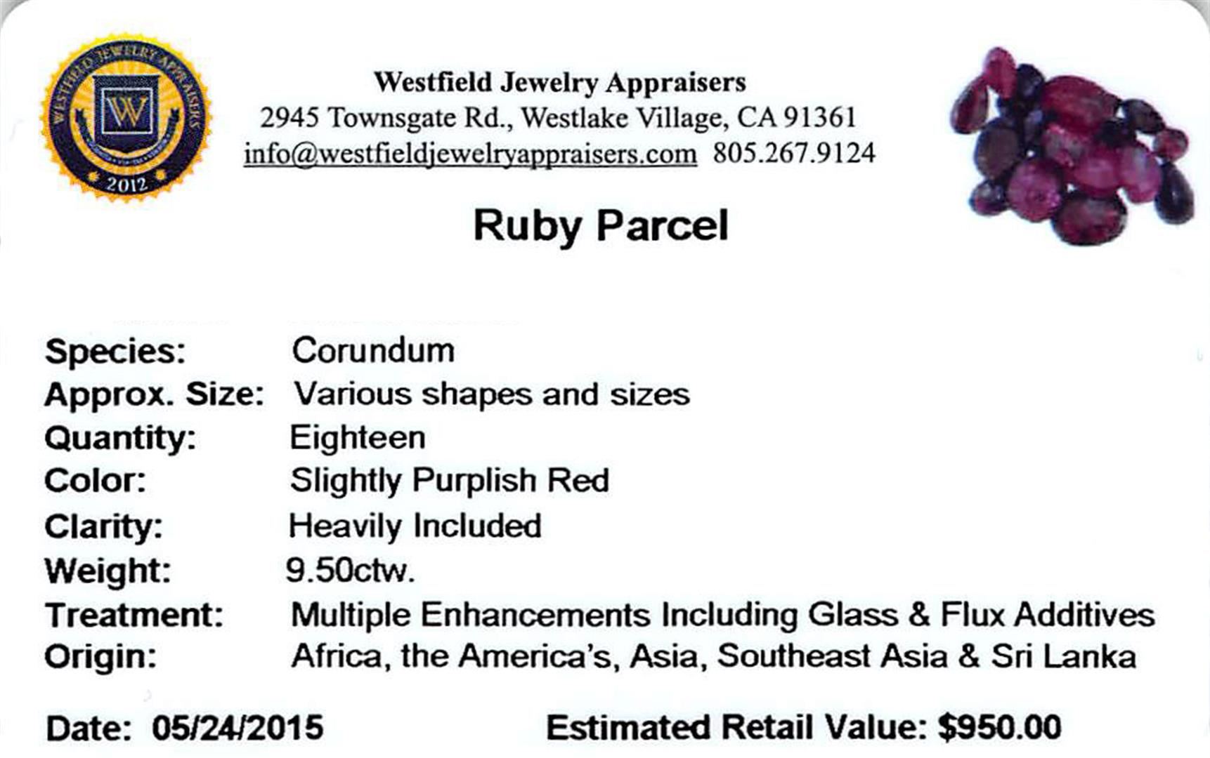 Eighteen various shapes & sizes cut natural rubies exact total weight 9.50ct., clarity is heavily included, type II, dark, very slightly brownish, slightly purplish red color, (GIA slpR 7/3), cut is good. Transmitting light somewhat diffusely, transparent to translucent. Naturally occurring internal & external characteristics are present. Indications of laboratory high temperature heat treatment, with glass & flux additives. Ruby has a low tolerance to rhodium plating, repolishing the surface, & ultrasonic cleaning. Westfield Appraised at $950.00.