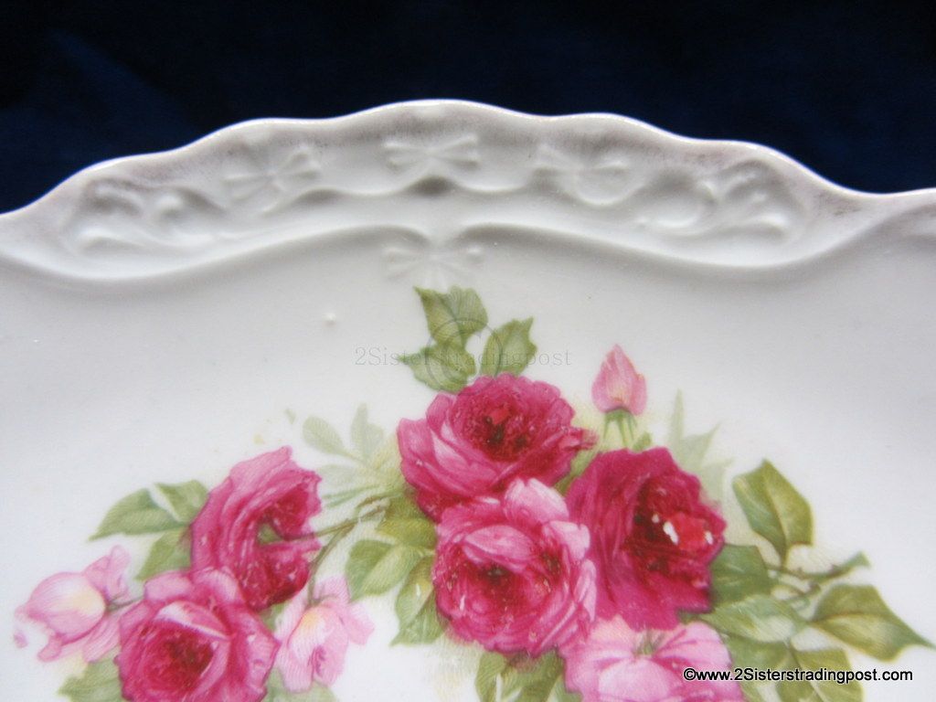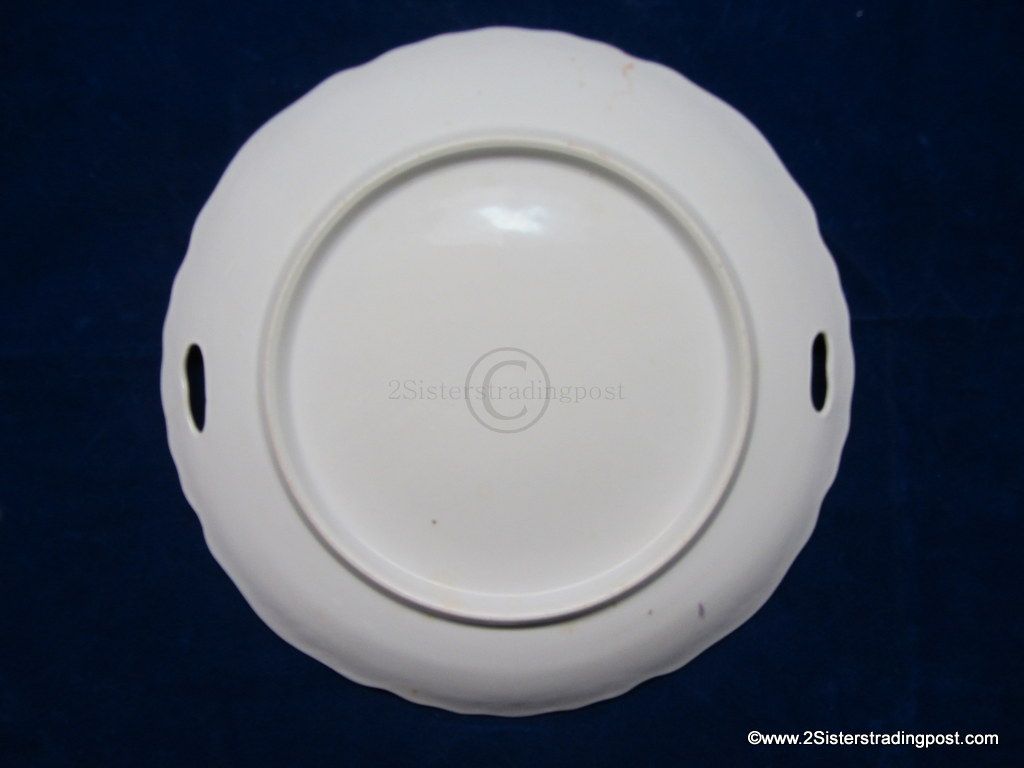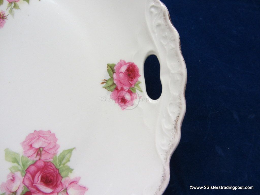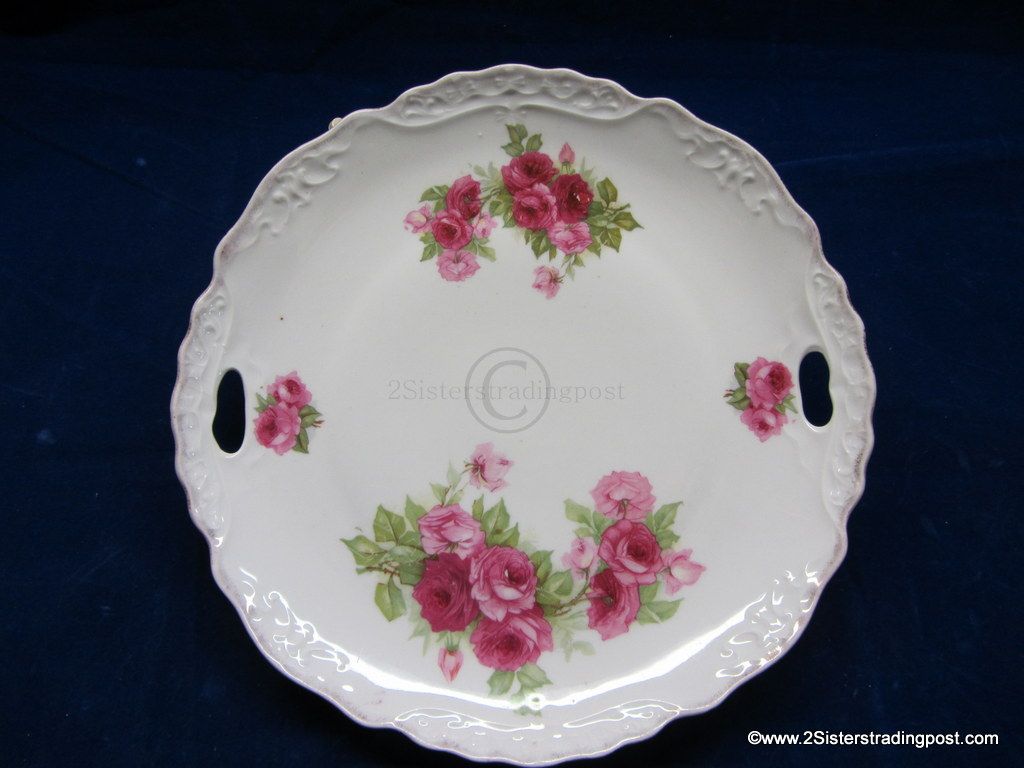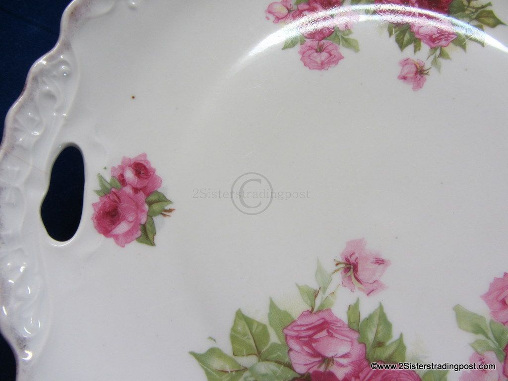 This is a very nice 9.5" older porcelain plate. The plate has a decorative edge with handles and is adorned with a beautiful rose pattern. This plate has been used as a wall hanging not as a serving plate beautiful piece with multiple functions. No back marks.