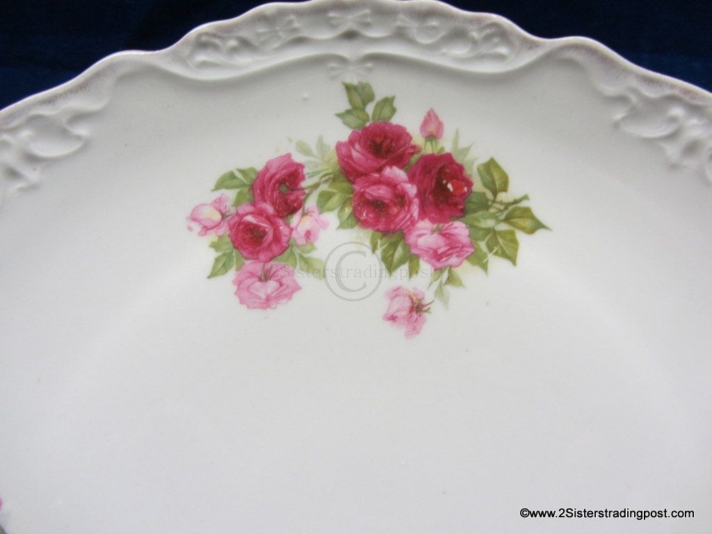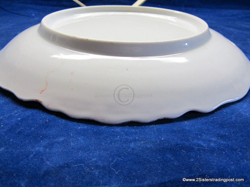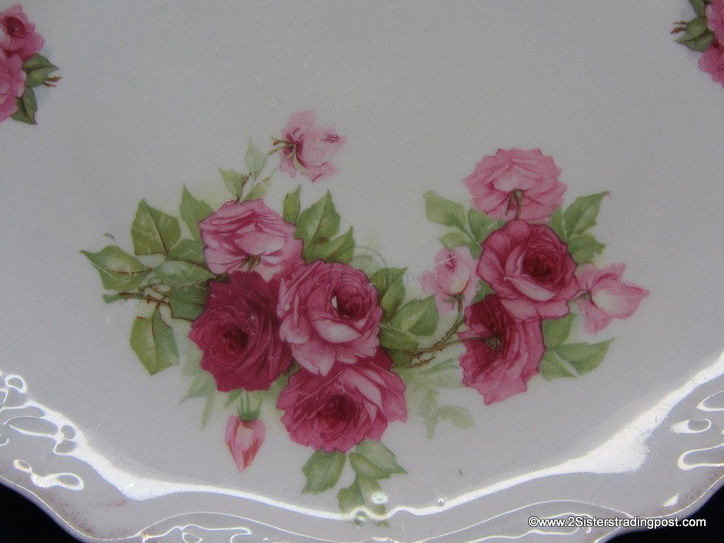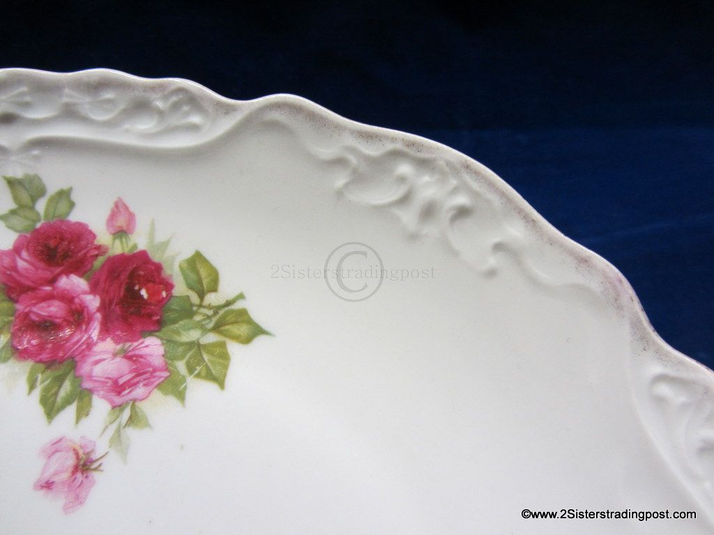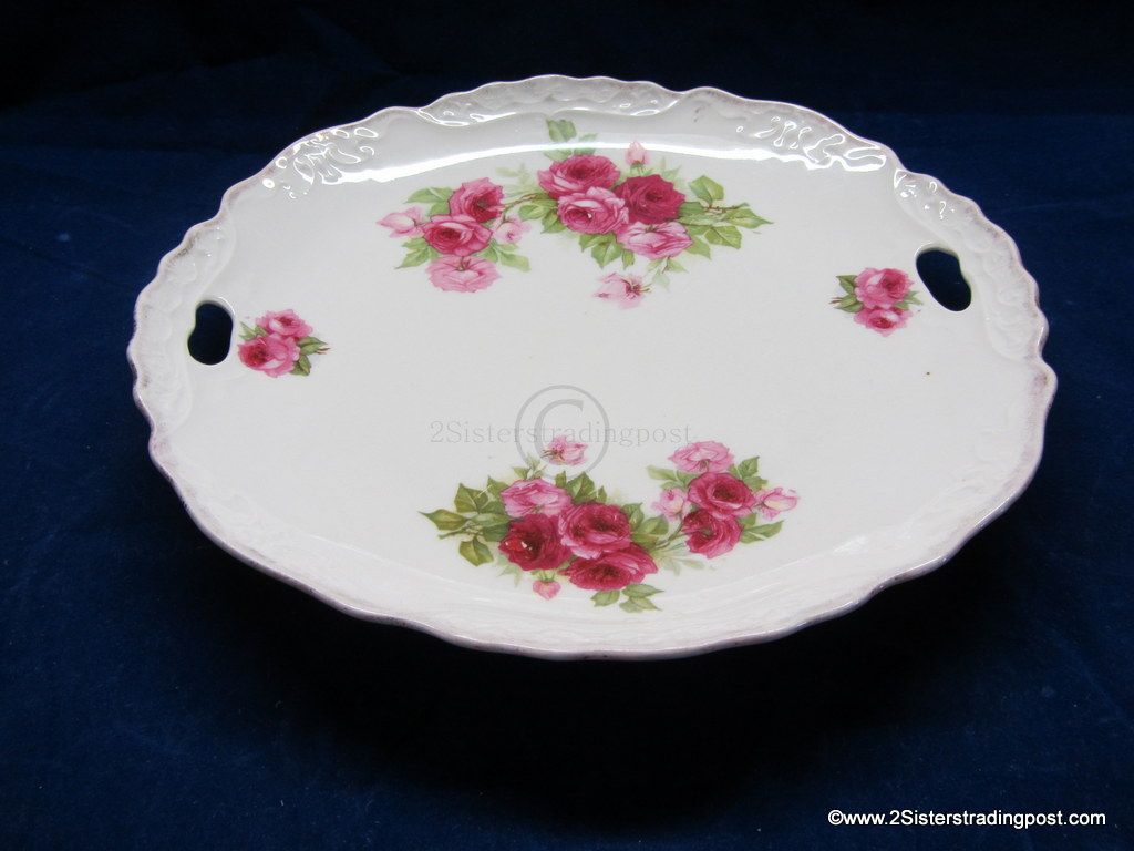 This is a very nice 9.5" older porcelain plate. The plate has a decorative edge with handles and is adorned with a beautiful rose pattern. This plate has been used as a wall hanging not as a serving plate beautiful piece with multiple functions. No back marks.