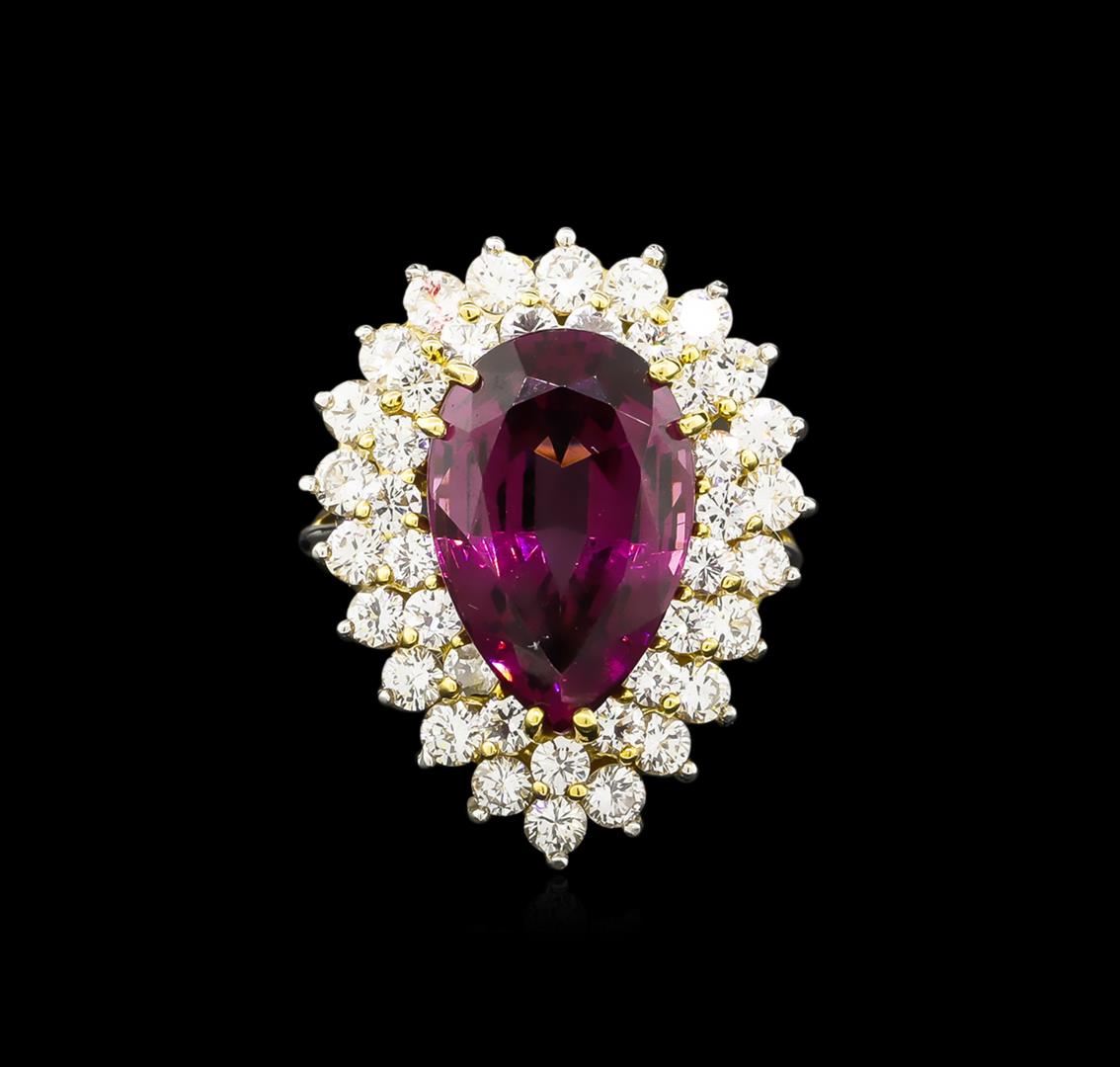One electronically tested 18KT white and yellow gold lady's hand assembled double halo ring with a basket wire mounting with a bright polish finish. The featured ladies' ring has a shank measuring 2.10 millimeters. Condition is used, good workmanship. Containing: One prong set pear modified brilliant cut natural rhodolite garnet, measuring 16.20 x 10.68 x 7.27mm, approximate weight of 9.50ct., clarity is eye clean, type II, medium, moderately strong, reddish purple color, (GIA rP 5/4), cut is very good. Colored gemstones are presumed to have been subjected to commonly used enhancement processes. Graded in the setting. Twenty-Two prong set round brilliant cut diamonds, measuring 2.70 - 2.60 x 1.64mm (depth est.) approximate total weight of 22 Stones = 1.55ct. Graded in the setting. Clarity: VS-1 to VS-2. Color: I - J. Cut Good Nineteen prong set round brilliant cut diamonds, measuring 2.50 - 2.40 x 1.52mm (depth est.) approximate total weight of 19 Stones = 1.10ct. Diamond is chipped. Graded in the setting. Clarity: VS-1 to VS-2. Color: H - I. Cut Good. Total Weight of Colored Stones 9.50ct. Total Weight of Diamonds 2.65ct. Total Weight of Ring 8.60gm. GAS Appraised at $8,005.00.