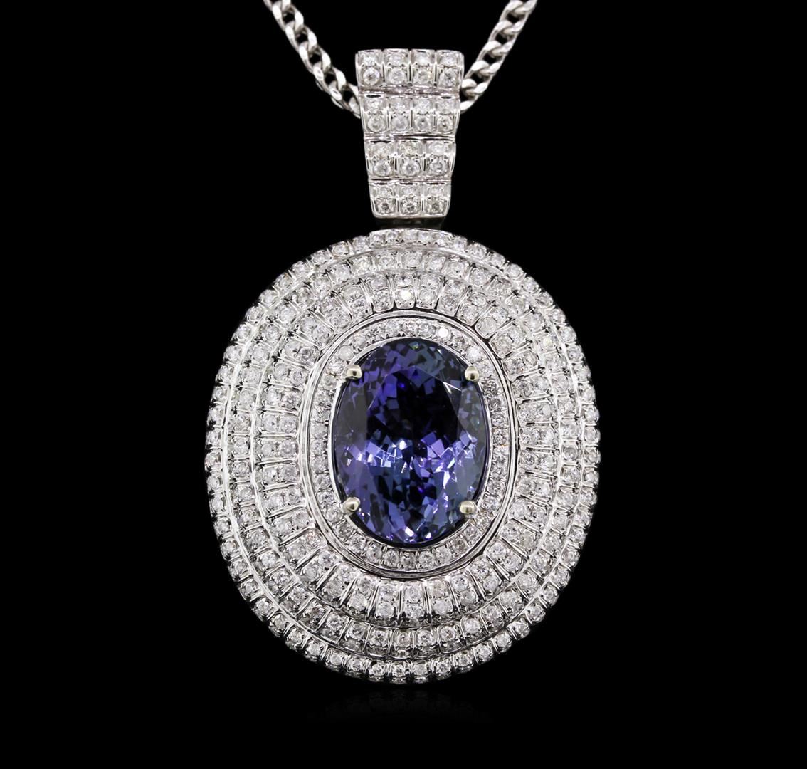 One electronically tested 14KT white gold ladies cast & assembled tanzanite and diamond pendant with chain. The seventeen inch length 14Kt white gold designer style chain features a pendant set within a diamond gallery, completed by a diamond set bail, terminating in a lobster claw clasp. Bright polish finish. Identified with markings of "14K RT". Condition is new, good workmanship. Containing: One prong set oval mixed cut natural tanzanite, measuring 14.90 x 10.80 x 8.00mm, approximate weight of 9.50ct., clarity is eye clean, type I, medium, very slightly grayish, blue color, (GIA B 5/3) to medium dark, very slightly grayish, bluish purple, (GIA bP 6/3), cut is good. Transmitting light with no distortion, transparent. Colored Stone Grading Report attached. Graded in the setting. Tanzanite is a very rare gemstone that is only found in the country of Tanzania. Originally discovered in 1967. Tiffany & Company, named the stone Tanzanite. It is found in the Usumburu Mountains that border the Umba Valley of northern Tanzania. Tanzanite occurs in gray, brown, violet, blue, reddish-purple, & green. The gem is interesting because of its exceptional pleochroism. Rotated in different directions a tanzanite will exhibit multiple changes of color. Tanzanite has a low tolerance to ultrasonic cleaning, and should not be cleaned using this method. Four Hundred bead set round brilliant cut diamonds, measuring 1.30 - 1.10 x 0.72mm (depth est.) approximate total weight of 400 Stones = 2.42ct. Graded in the setting. Clarity: I-1 to I-2. Color: G - I. Total Weight of Colored Stones 9.50ct. Total Weight of Diamonds 2.42ct. AIG Appraised at $31,000.00.