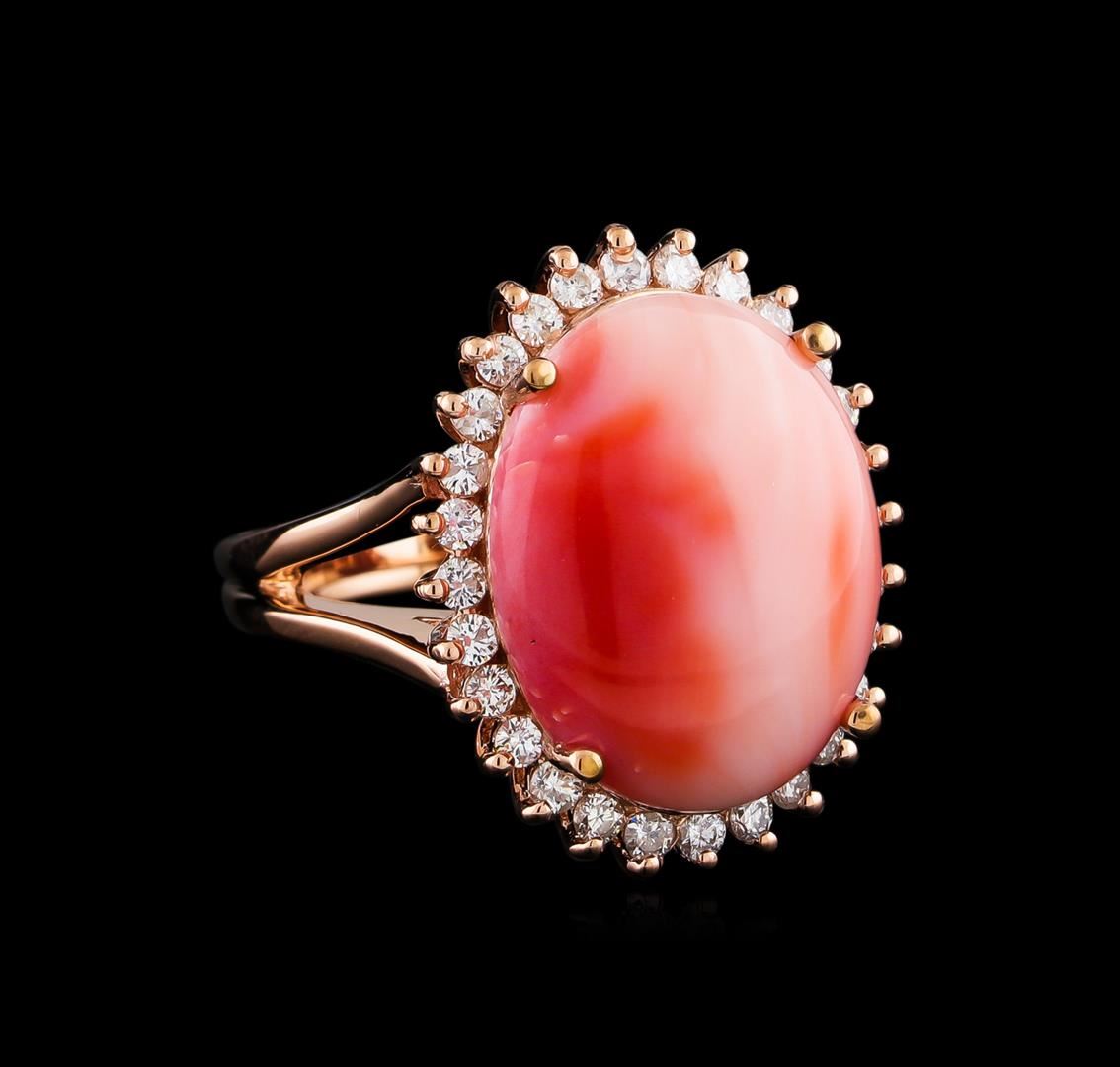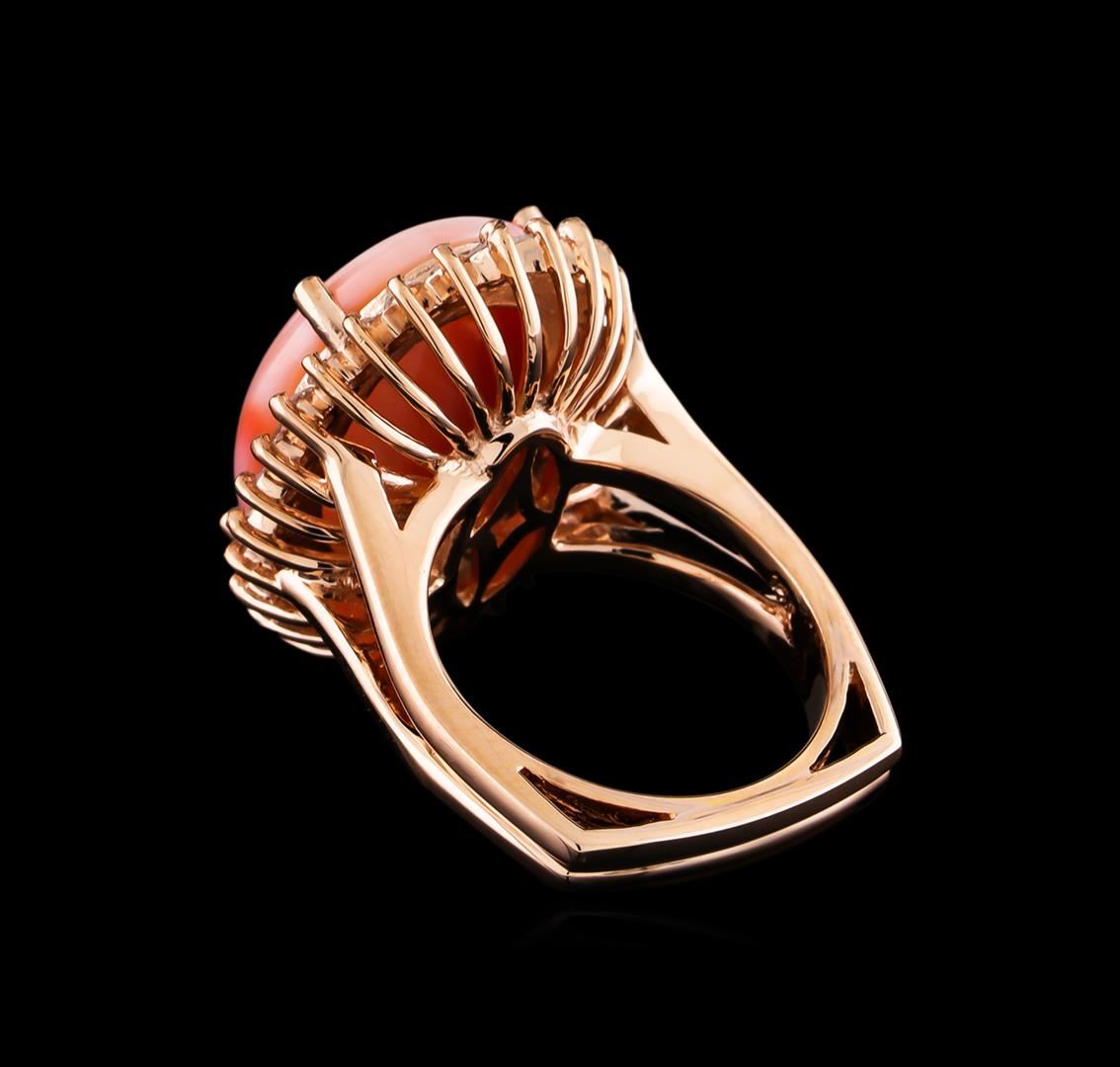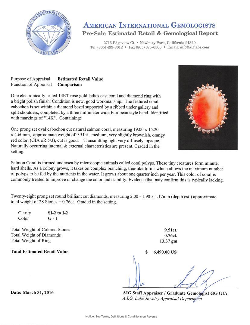 One electronically tested 14KT rose gold ladies cast coral and diamond ring with a bright polish finish. The featured coral cabochon is set within a diamond bezel supported by a ribbed under gallery and split shoulders, completed by a three millimeter wide European style band. Identified with markings of "14K". Condition is new, good workmanship. Containing: One prong set oval cabochon cut natural salmon coral, measuring 19.00 x 15.20 x 4.60mm, approximate weight of 9.51ct., medium, very slightly brownish, orangy red color, (GIA oR 5/3), cut is good. Transmitting light very diffusely, opaque. Naturally occurring internal & external characteristics are present. Graded in the setting. Salmon Coral is formed undersea by microscopic animals called coral polyps. These tiny, creatures form minute, hard shells. As a colony grows, it takes on complex branching, tree-like forms which allows the maximum number of polyps to be fed by the nutrients in the water. It grows about one quarter inch per year. This color of coral is commonly treated to improve or change the color and stability. Evidence that may confirm this is typically lacking. Twenty-Eight prong set round brilliant cut diamonds, measuring 2.00 - 1.90 x 1.17mm (depth est.) approximate total weight of 28 Stones = 0.76ct. Graded in the setting. Clarity: SI-2 to I-2. Color: G - I. Total Weight of Colored Stones 9.51ct. Total Weight of Diamonds 0.76ct. Total Weight of Ring 13.37gm. AIG Appraised at $6,490.00.