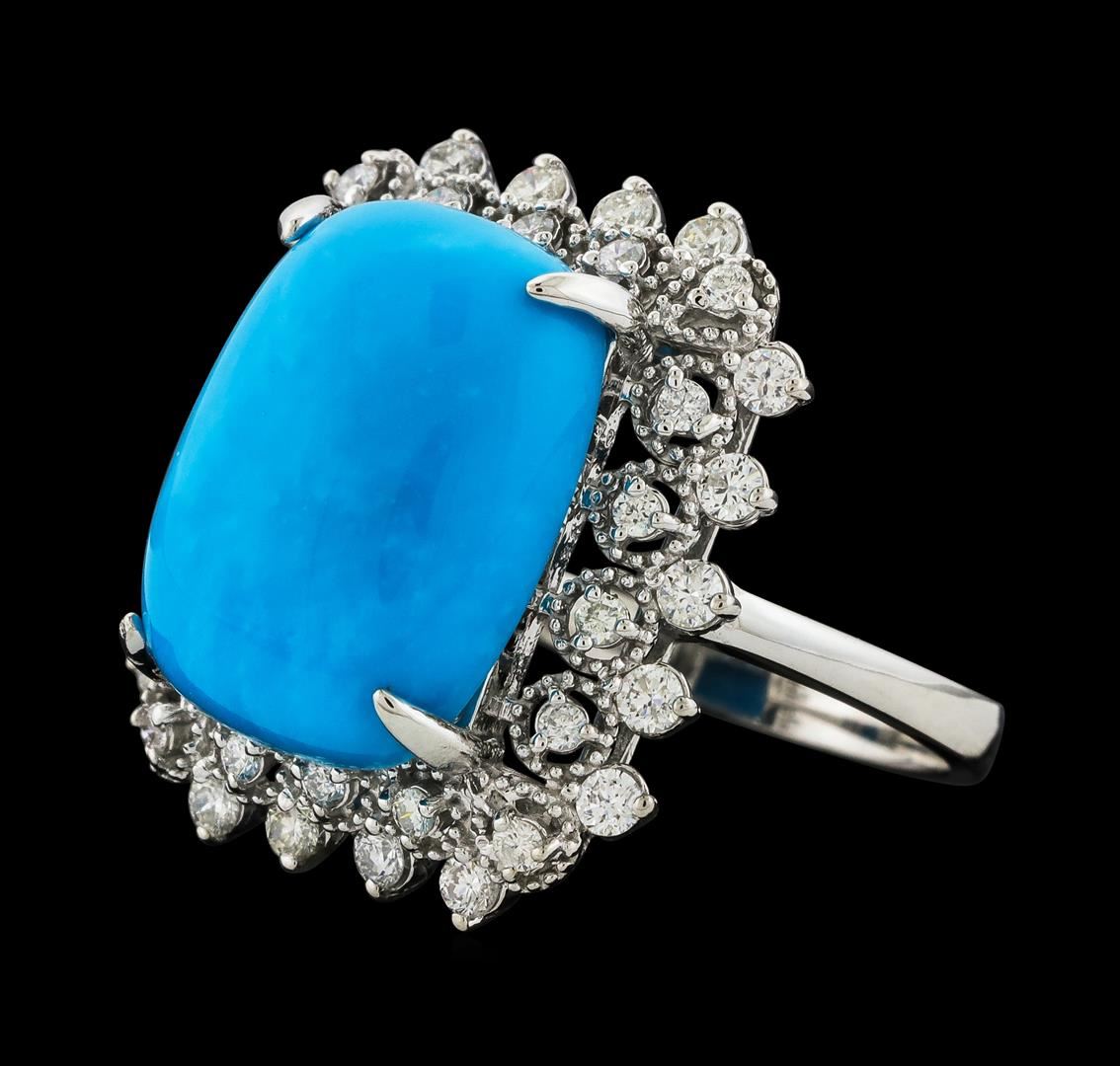 One Turquoise and Diamond Ring featuring: 14KT White Gold with a total weight of 5.85 grams, Turquoise with a total weight of 9.51ct, and 36 diamonds with a total weight of 0.70ctw.