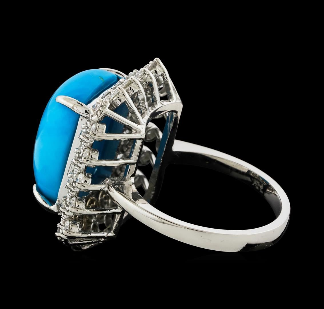 One Turquoise and Diamond Ring featuring: 14KT White Gold with a total weight of 5.85 grams, Turquoise with a total weight of 9.51ct, and 36 diamonds with a total weight of 0.70ctw.