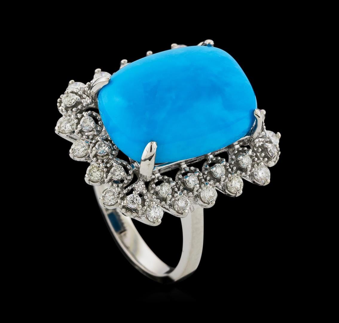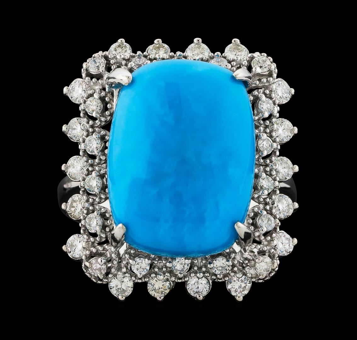 One Turquoise and Diamond Ring featuring: 14KT White Gold with a total weight of 5.85 grams, Turquoise with a total weight of 9.51ct, and 36 diamonds with a total weight of 0.70ctw.
