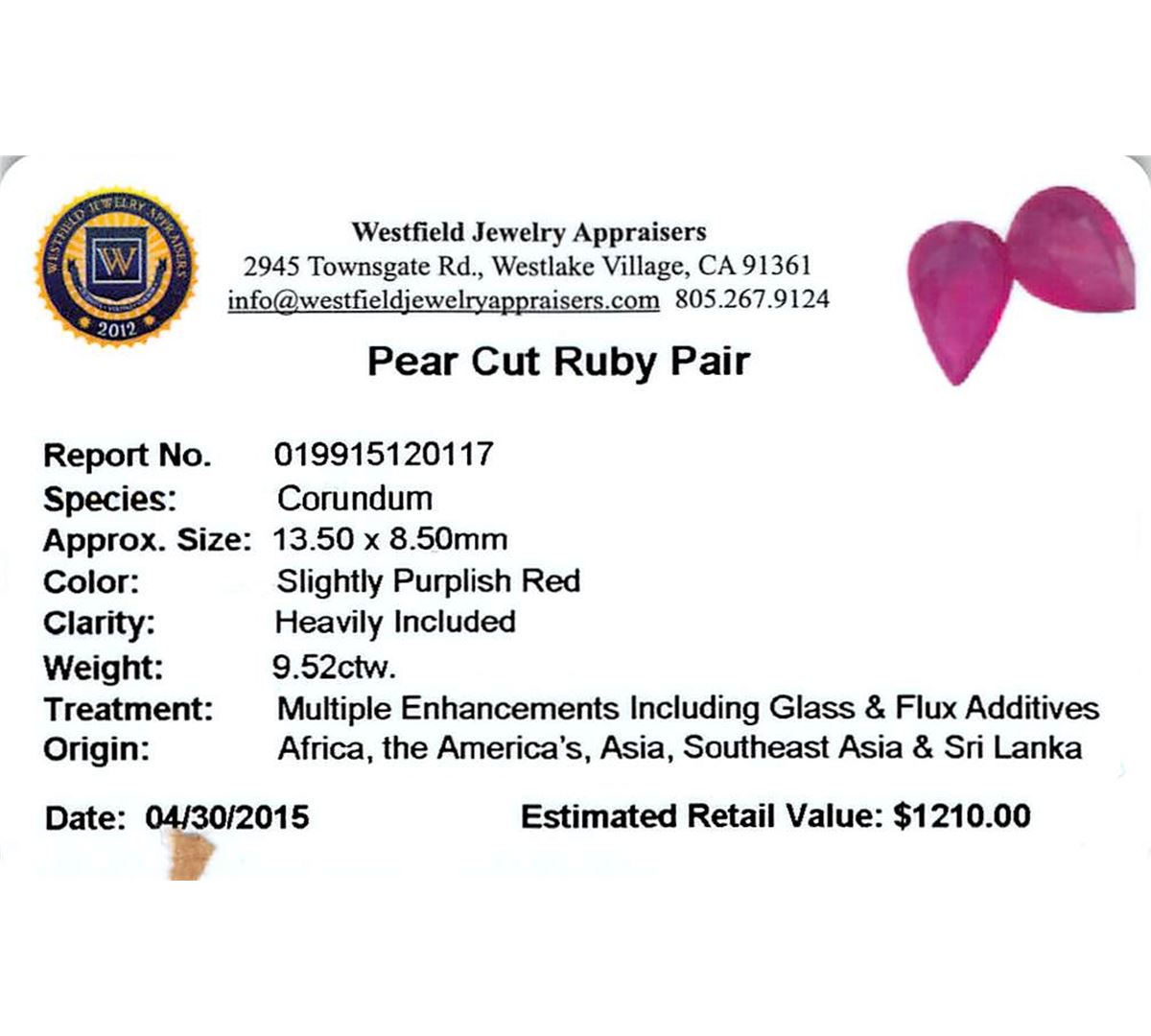 Two pear mixed cut natural rubies exact total weight 9.52ct., clarity is heavily included, type II, medium dark, very slightly brownish, slightly purplish red color, (GIA slpR 6/3), cut is good. Westfield Appraised at $1,210.00.