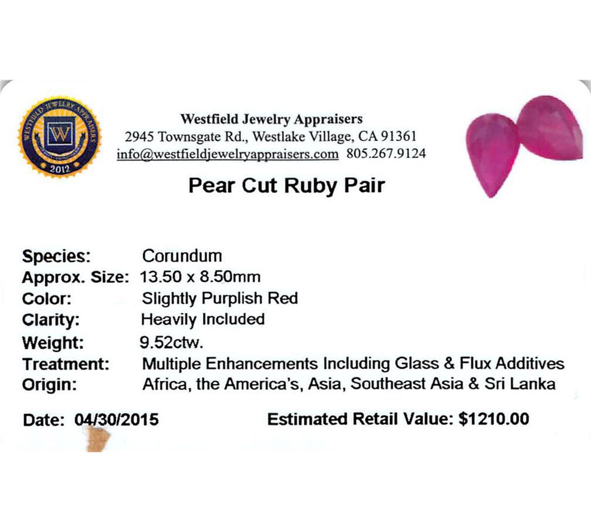 Two pear mixed cut natural rubies exact total weight 9.52ct., clarity is heavily included, type II, medium dark, very slightly brownish, slightly purplish red color, (GIA slpR 6/3), cut is good. Westfield Appraised at $1,210.00.