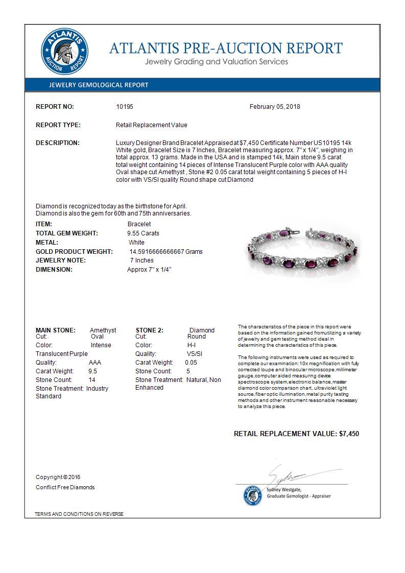 REF-96W9F -10195 ---- 9.55 CTW Amethyst & Diamond Bracelet 14K White Gold ---- Luxury Designer Brand Bracelet Appraised at $7,450 Certificate Number US10195 14k White gold, Bracelet Size is 7 Inches, Bracelet measuring approx. 7" x 1/4", weighing in total approx. 13 grams. Made in the USA and is stamped 14k, Main stone 9.5 carat total weight containing 14 pieces of Intense Translucent Purple color with AAA quality Oval shape cut Amethyst , Stone #2 0.05 carat total weight containing 5 pieces of H-I color with VS/SI quality Round shape cut Diamond
