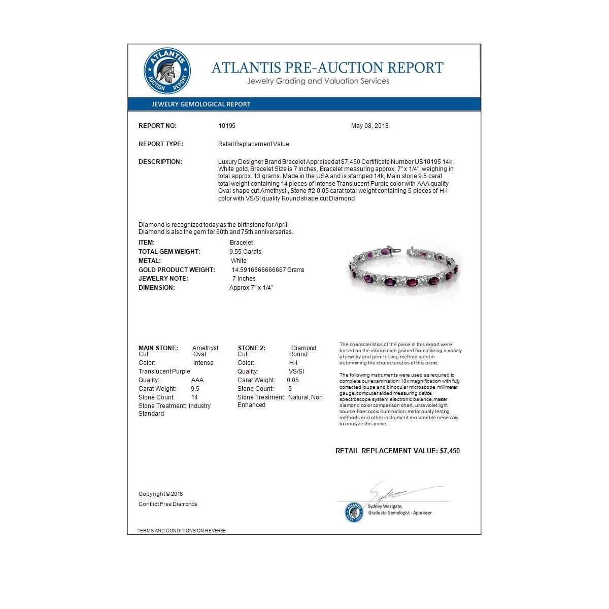 REF-96W9F -10195 ---- 9.55 CTW Amethyst & Diamond Bracelet 14K White Gold ---- Luxury Designer Brand Bracelet Appraised at $7,450 Certificate Number US10195 14k White gold, Bracelet Size is 7 Inches, Bracelet measuring approx. 7" x 1/4", weighing in total approx. 13 grams. Made in the USA and is stamped 14k, Main stone 9.5 carat total weight containing 14 pieces of Intense Translucent Purple color with AAA quality Oval shape cut Amethyst , Stone #2 0.05 carat total weight containing 5 pieces of H-I color with VS/SI quality Round shape cut Diamond