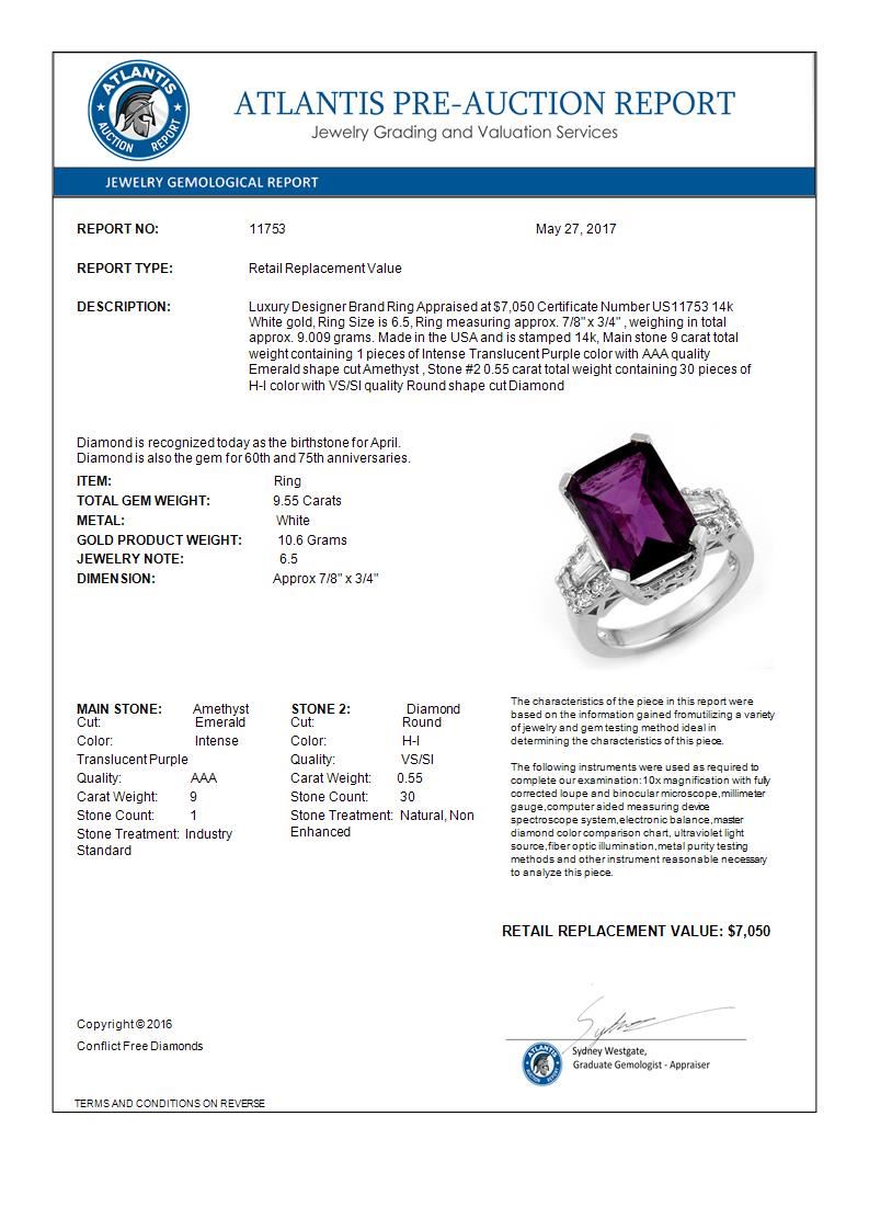 9.55 CTW Amethyst & Diamond Ring 14K White Gold ---- Luxury Designer Brand Ring Appraised Retail Price at $7,050 ---- SKU Number US11753 14k White gold Ring Size is 6.5, Ring measuring approx. 7/8" x 3/4" , weighing in total approx. 9.009 grams. Made in the USA and is stamped 14k, Main stone 9 carat total weight containing 1 pieces of Intense Translucent Purple color with AAA quality Emerald shape cut Amethyst , Stone #2 0.55 carat total weight containing 30 pieces of H-I color with VS/SI quality Round shape cut
