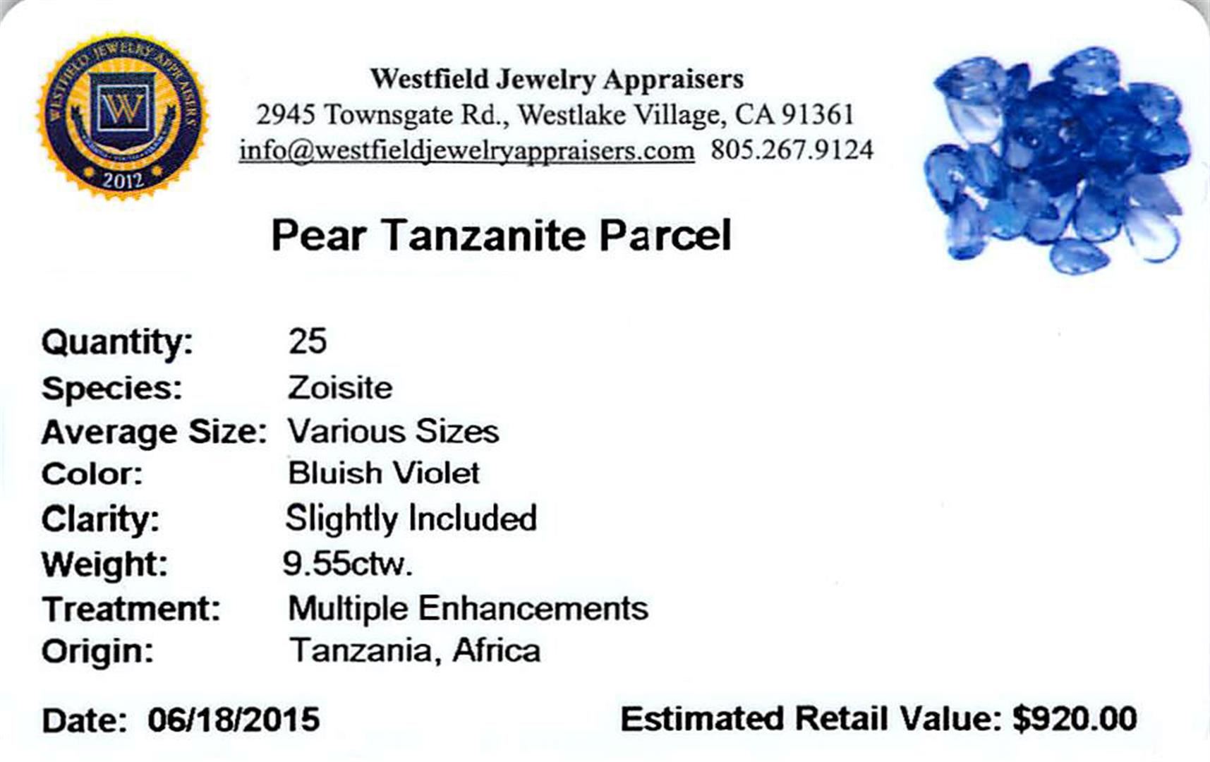 Twenty-five pear mixed cut natural tanzanites exact total weight 9.55ct., clarity is slightly included, type I, medium dark, very slightly grayish, bluish violet color, (GIA bV 6/3), cut is good. Transmitting light with a minimum of distortion, transparent. Naturally occurring internal & external characteristics are present. Color grade is an average for the group. Tanzanite is a very rare gemstone that is only found in the country of Tanzania. Originally discovered in 1967. Tiffany & Company, named the stone Tanzanite. It is found in the Usumburu Mountains that border the Umba Valley of northern Tanzania. Tanzanite occurs in gray, brown, violet, blue, reddish-purple, & green. The gem is interesting because of its exceptional pleochroism. Rotated in different directions a tanzanite will exhibit multiple changes of color. Tanzanite has a low tolerance to ultrasonic cleaning, and should not be cleaned using this method. Westfield Appraised at $920.00.