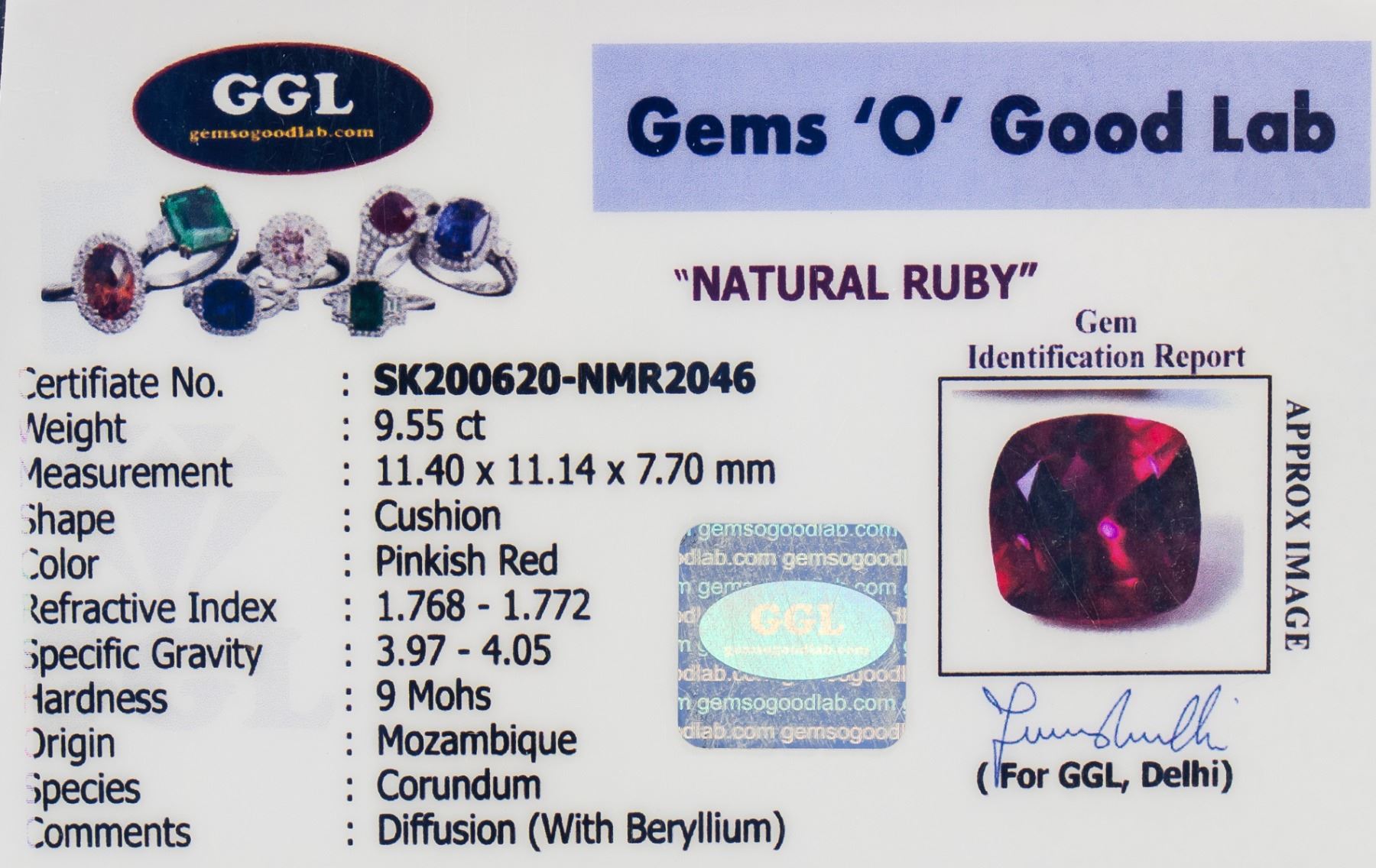 One (1) cushion cut pinkish red natural ruby. Origin: Mozambique. 11.40 x 11.14 x 7.7 mm. Accompanied with GGL certificate.