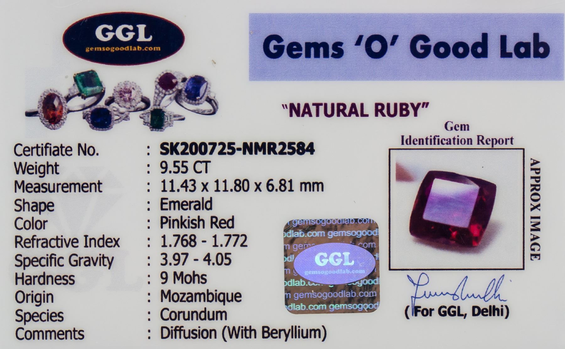 One (1) 9.55 ct emerald cut pinkish red natural ruby. Origin: Mozambique. Accompanied with GGL certificate. 11.43 x 11.80 x 6.80 mm