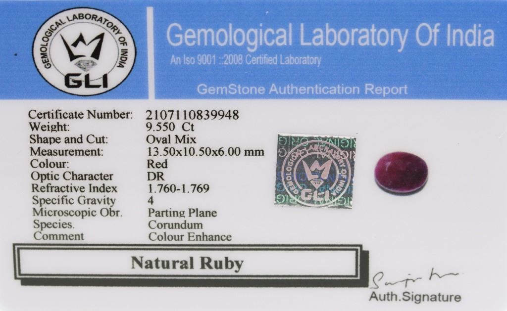 9.55 ct oval cut red natural ruby. Accompanied with GLI certificate. 13.50 x 10.50 x 6.00 mm.