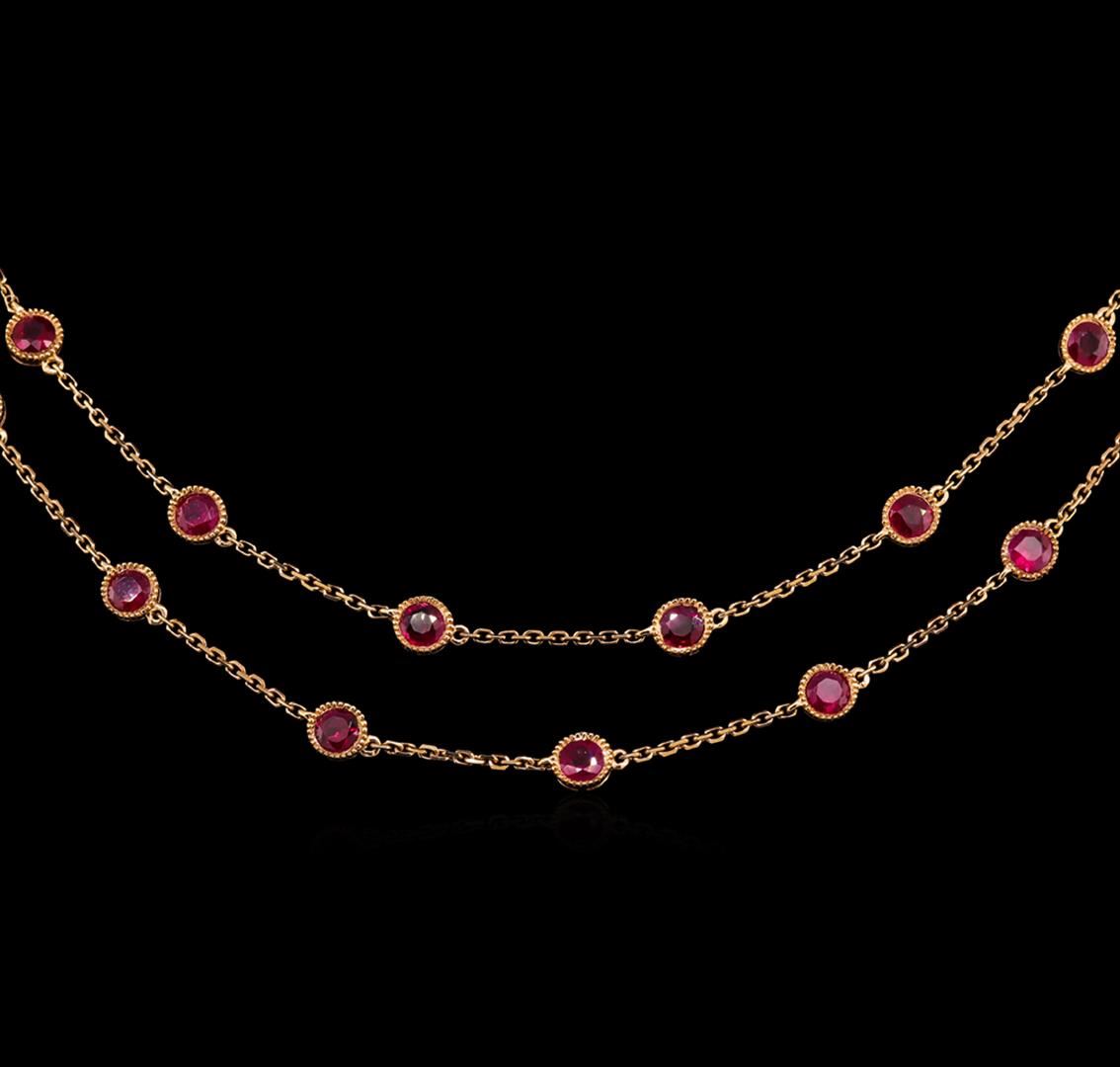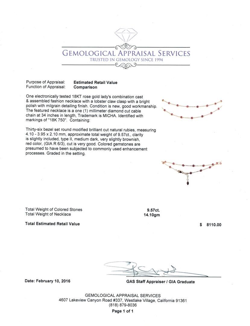 One electronically tested 18KT rose gold lady's combination cast & assembled fashion necklace with a lobster claw clasp with a bright polish with milgrain detailing finish. The featured necklace is a one (1) millimeter diamond cut cable chain at 34 inches in length, Trademark is MICHA. Identified with markings of "18K 750". Condition is new, good workmanship. Containing: Thirty-six bezel set round modified brilliant cut natural rubies, measuring 4.10 - 3.95 x 2.10 mm, approximate total weight of 9.57ct., clarity is slightly included, type II, medium dark, very slightly brownish, red color, (GIA R 6/3), cut is very good. Colored gemstones are presumed to have been subjected to commonly used enhancement processes. Graded in the setting. Total Weight of Colored Stones 9.57ct. Total Weight of Necklace 14.10gm. GAS Appraised at $8,110.00.