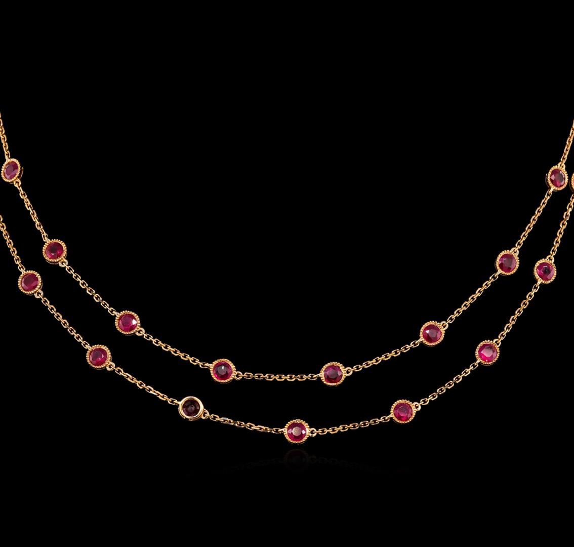 One electronically tested 18KT rose gold lady's combination cast & assembled fashion necklace with a lobster claw clasp with a bright polish with milgrain detailing finish. The featured necklace is a one (1) millimeter diamond cut cable chain at 34 inches in length, Trademark is MICHA. Identified with markings of "18K 750". Condition is new, good workmanship. Containing: Thirty-six bezel set round modified brilliant cut natural rubies, measuring 4.10 - 3.95 x 2.10 mm, approximate total weight of 9.57ct., clarity is slightly included, type II, medium dark, very slightly brownish, red color, (GIA R 6/3), cut is very good. Colored gemstones are presumed to have been subjected to commonly used enhancement processes. Graded in the setting. Total Weight of Colored Stones 9.57ct. Total Weight of Necklace 14.10gm. GAS Appraised at $8,110.00.