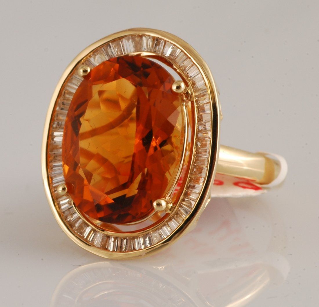 Red citrine 8.97 carats total weight center stone is surrounded by baguette diamonds 0.60 total carat weight in 14K white gold. Total weight in gold is 4.86 grams.