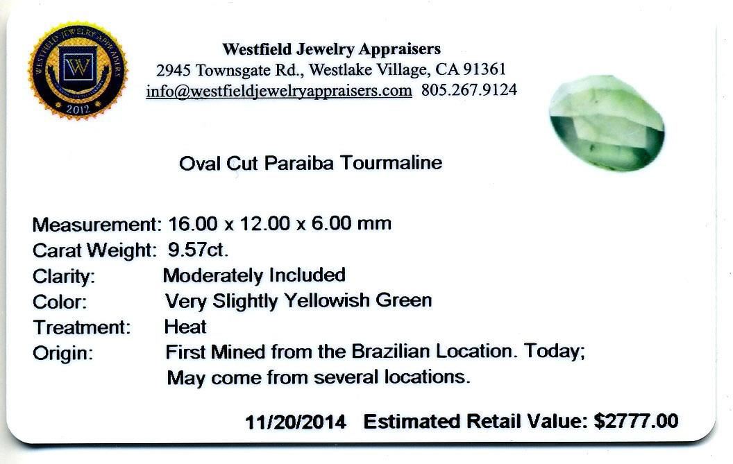 9.57ctw. Oval Cut Paraiba Tourmaline. Westfield Appraised at $2,777.00.