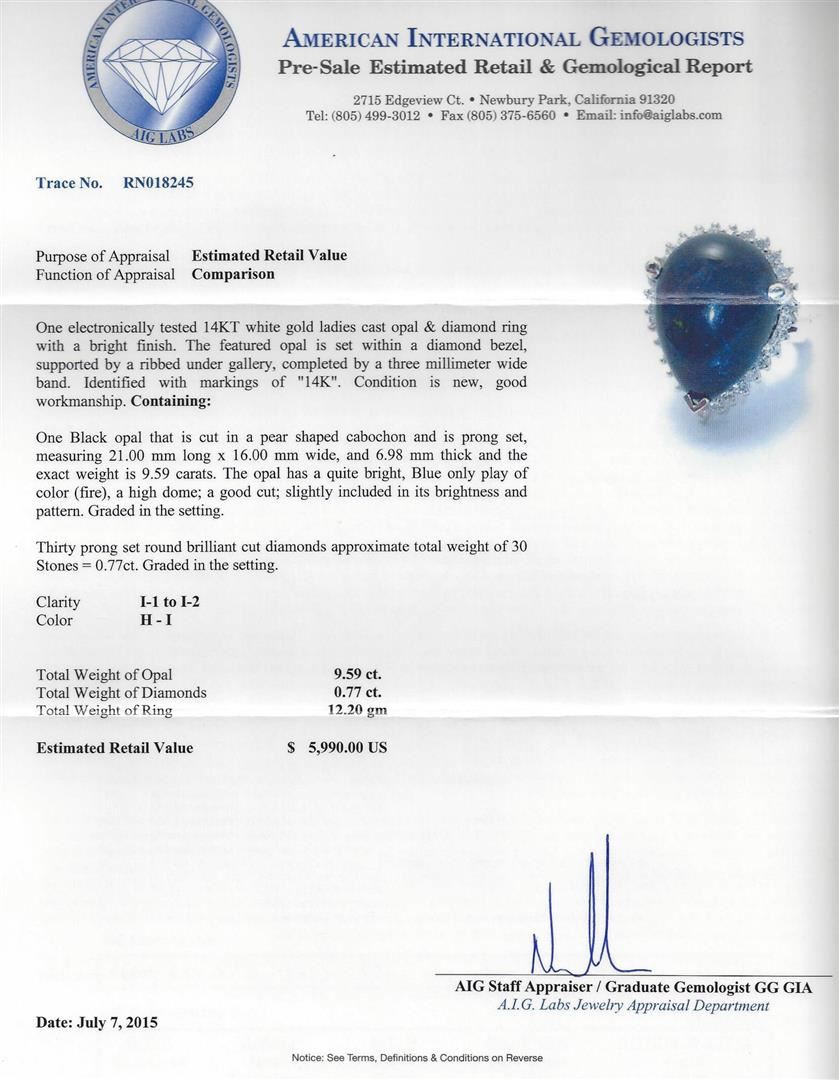 One electronically tested 14KT white gold ladies cast opal & diamond ring with a bright finish. Condition is new, good workmanship. The featured opal is set within a diamond bezel, supported by a ribbed under gallery, completed bya three millimeter wide band. Identified with markings of "14K". Containing: One black opal that is cut in a pear shaped cabochon and is prong set, measuring21.00 mm long x 16.00 mm wide, and 6.98 mm thick and the exact weight is 9.59carats. The opal has a quite bright, blue only play of color (fire) in a pattern; a high dome; a good cut; slightly included in its brightness and pattern; and is . Graded in the setting. Thirty prong set round brilliant cut diamonds approximate total weight of 30 Stones = 0.77ct. Graded in the setting. Clarity: I-1 to I-2.Color: H - I. AIG Appraised at $5,990.00.