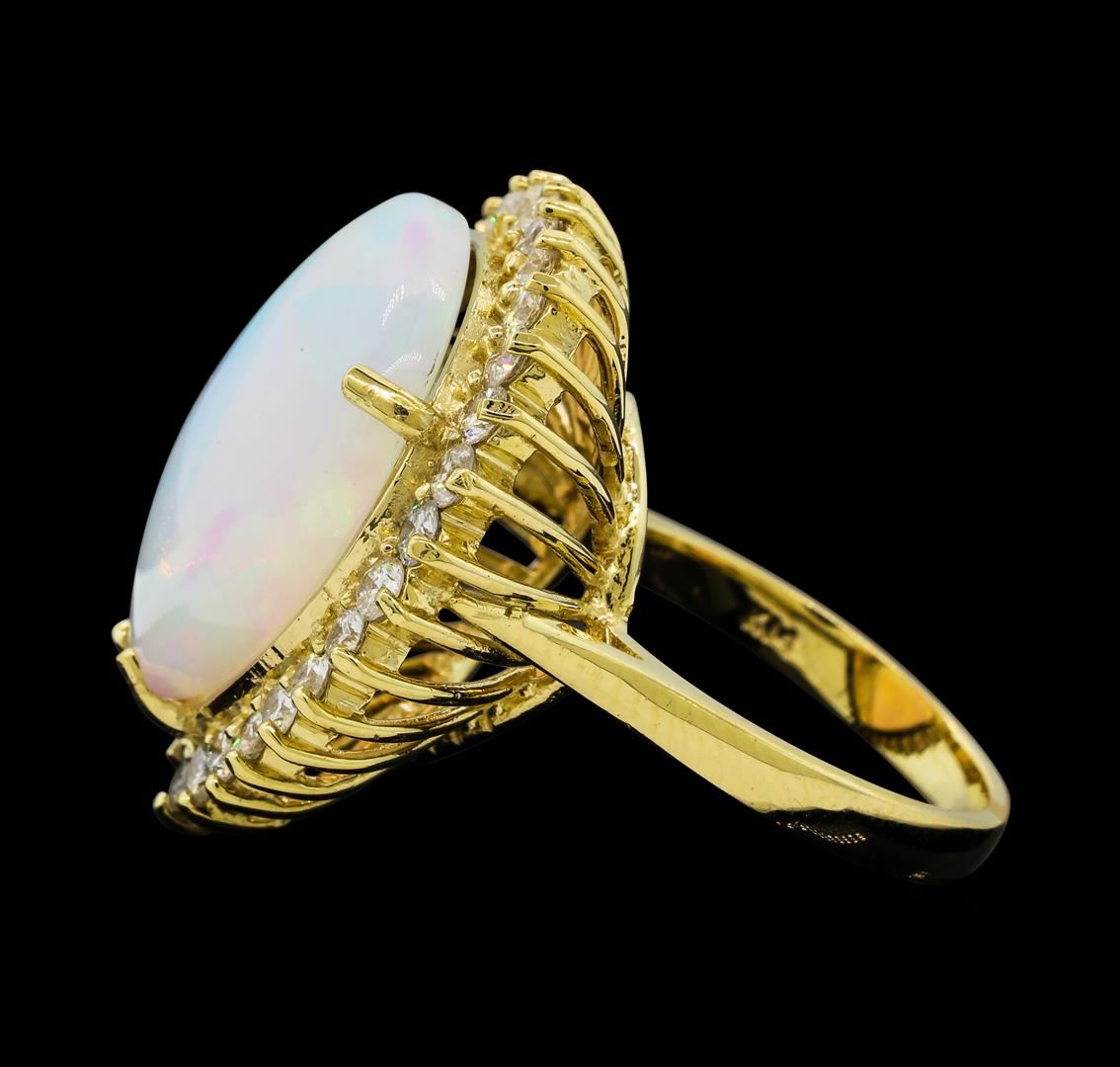 One electronically tested 14KT yellow gold lady's cast fashion ring with a basket halo with a bright polish finish. The featured lady's ring has a shank measuring 2.59 millimeters wide. Identified with markings of 'K14'. Condition is new, good workmanship. Containing: One crystal opal that is cut in a pear shaped cabochon and is prong set, measuring 19.63 mm long x 17.34 mm wide, and 6.85 mm thick and the approximate weight is 9.60 carats. The opal has a quite bright, multicolor play of color (fire) in a rolling flashfire pattern; a low dome; a good cut; no inclusions; minor dull spot in its brightness and pattern; and is slightly directional. Graded in the setting. Twenty-Nine prong set round brilliant cut diamonds, measuring 2.40 - 2.30 x 1.43mm (depth est.) approximate total weight of 29 Stones = 1.40ct. Graded in the setting. Clarity SI-1 to I-1. Color: G - I Cut Good. Total Weight of Diamonds 1.40ct.. Total Weight of Opals 9.60ct.. Total Weight of Ring 10.10gm. GAS Appraised at $7,840.00.