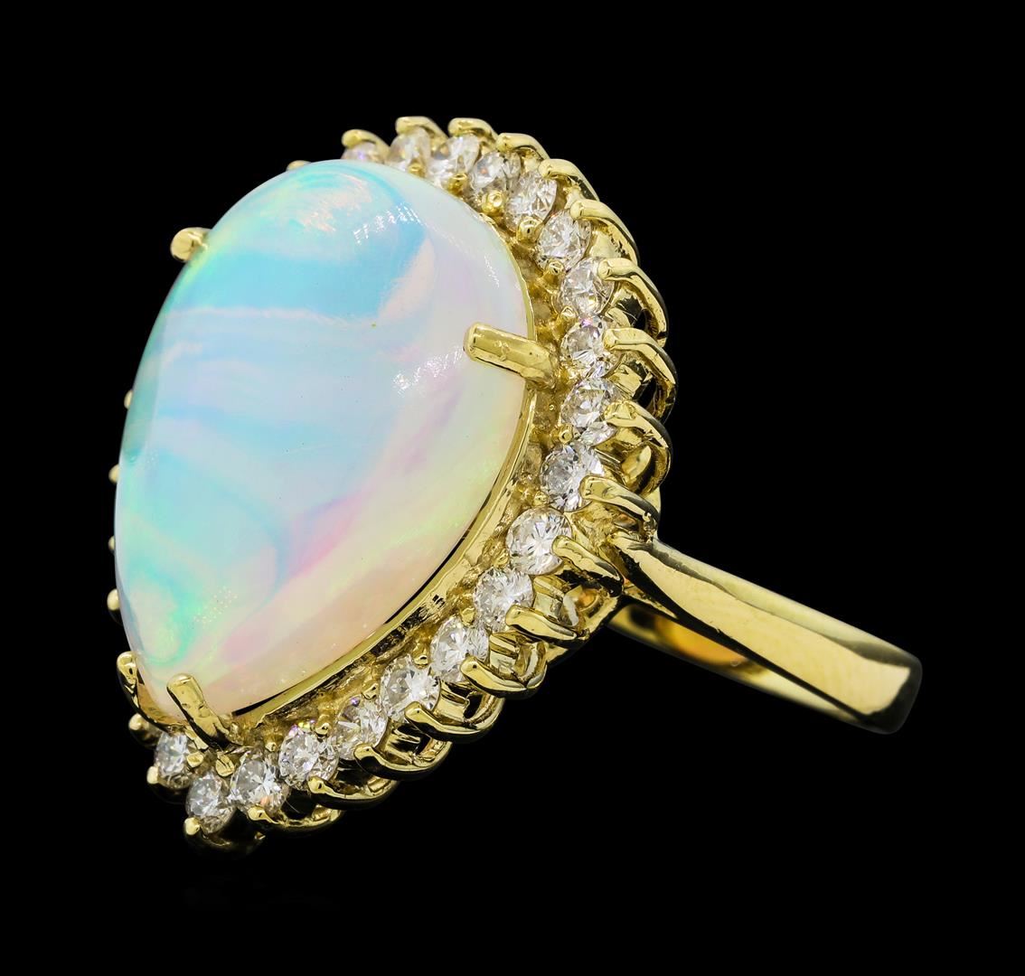 One electronically tested 14KT yellow gold lady's cast fashion ring with a basket halo with a bright polish finish. The featured lady's ring has a shank measuring 2.59 millimeters wide. Identified with markings of 'K14'. Condition is new, good workmanship. Containing: One crystal opal that is cut in a pear shaped cabochon and is prong set, measuring 19.63 mm long x 17.34 mm wide, and 6.85 mm thick and the approximate weight is 9.60 carats. The opal has a quite bright, multicolor play of color (fire) in a rolling flashfire pattern; a low dome; a good cut; no inclusions; minor dull spot in its brightness and pattern; and is slightly directional. Graded in the setting. Twenty-Nine prong set round brilliant cut diamonds, measuring 2.40 - 2.30 x 1.43mm (depth est.) approximate total weight of 29 Stones = 1.40ct. Graded in the setting. Clarity SI-1 to I-1. Color: G - I Cut Good. Total Weight of Diamonds 1.40ct.. Total Weight of Opals 9.60ct.. Total Weight of Ring 10.10gm. GAS Appraised at $7,840.00.