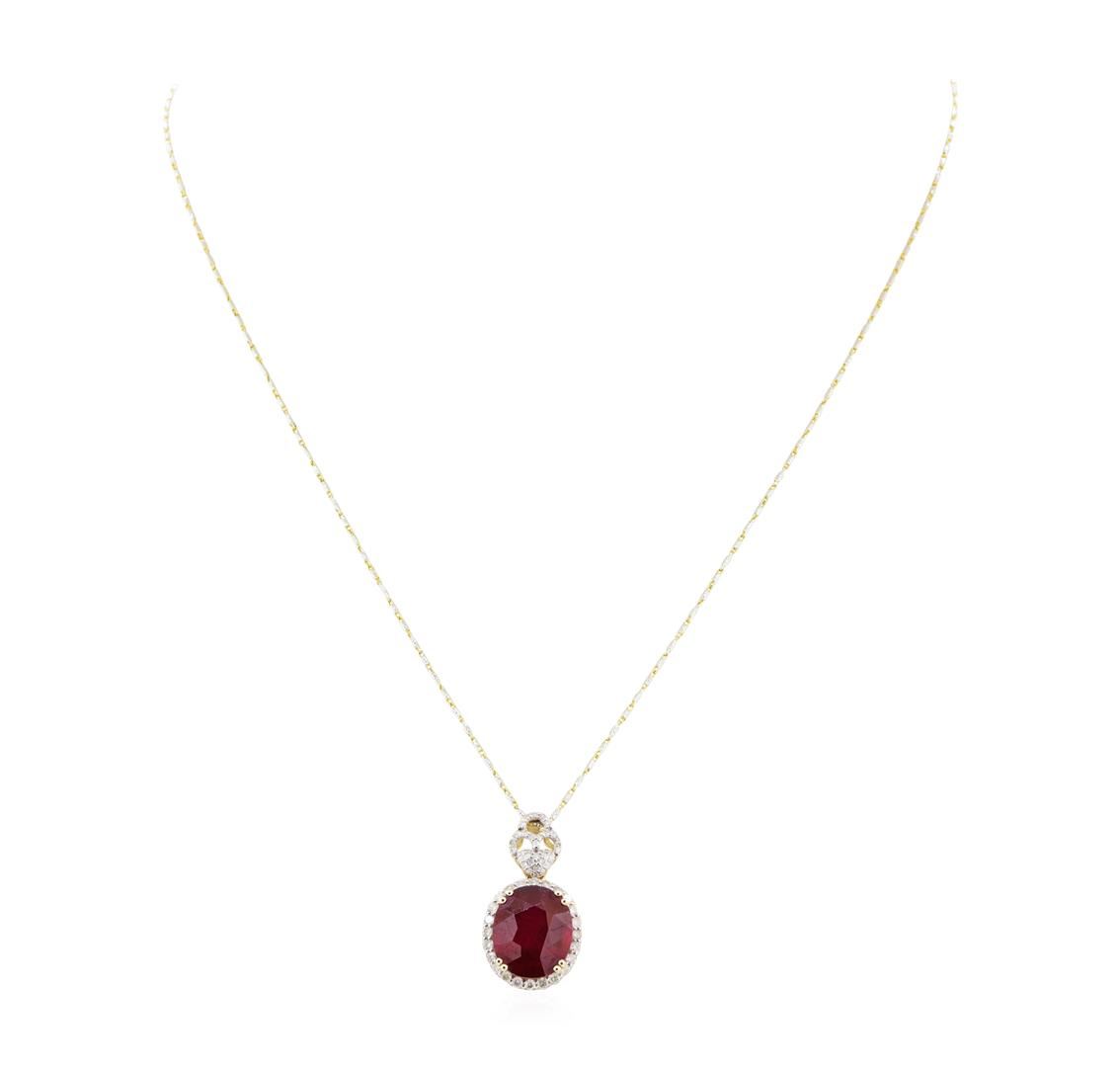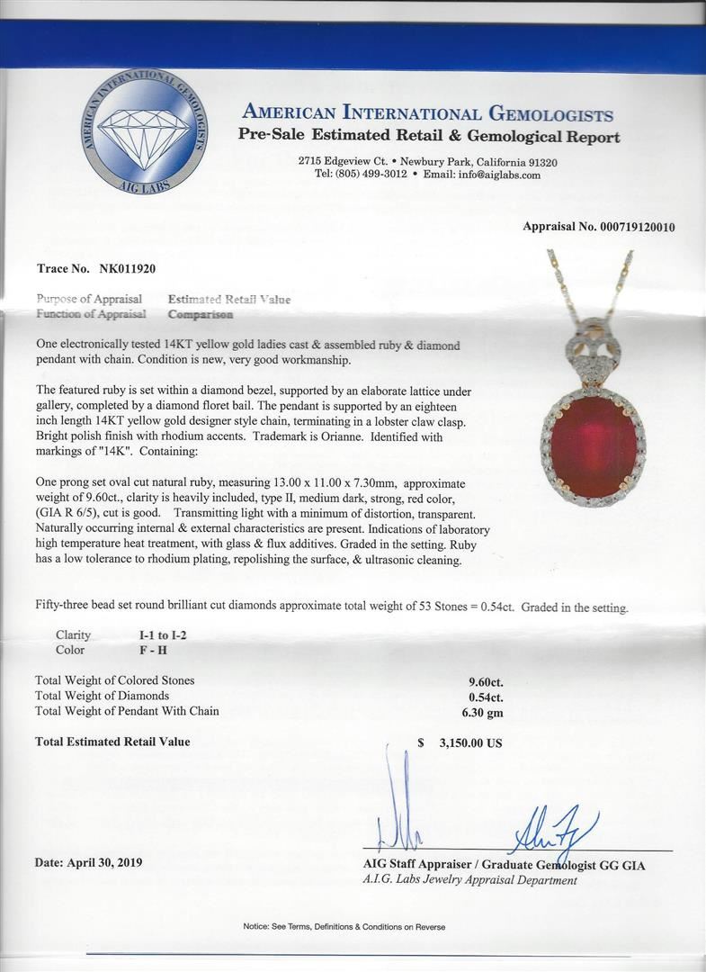 One electronically tested l4KT yellow gold ladies cast & assembled ruby & diamond pendant with chain. Condition is new, very good workmanship. The featured ruby is set within a diamond bezel, supported by an elaborate lattice under gallery, completed by a diamond ?oret bail. The pendant is supported by an eighteen inch length l4KT yellow gold designer style chain, terminating in a lobster claw clasp. Bright polish ?nish with rhodium accents. Trademark is Orianne. Identi?ed with markings of "14K". Containing: One prong set oval cut natural ruby, measuring 13.00 x 11.00 x 7.3Omm, approximate weight of 9.6Oct., clarity is heavily included, type II, medium dark, strong, red color, (GIA R 6/5), cut is good. Transmitting light with a minimum of distortion, transparent. Naturally occurring internal & external characteristics are present. Indications of laboratory high temperature heat treatment, with glass & ?ux additives. Graded in the setting. Ruby has a low tolerance to rhodium plating, repolishing the surface, & ultrasonic cleaning. Fi?y-three bead set round brilliant cut diamonds approximate total weight of 53 Stones = 0.54ct. Graded in the setting. Clarity I-1 to I-2 Color F - H Total Weight of Colored Stones 9.60ct. Total Weight of Diamonds 0.54ct. Total Weight of Pendant With Chain 6.30 gm Total Estimated Retail Value $ 3,150.00 US